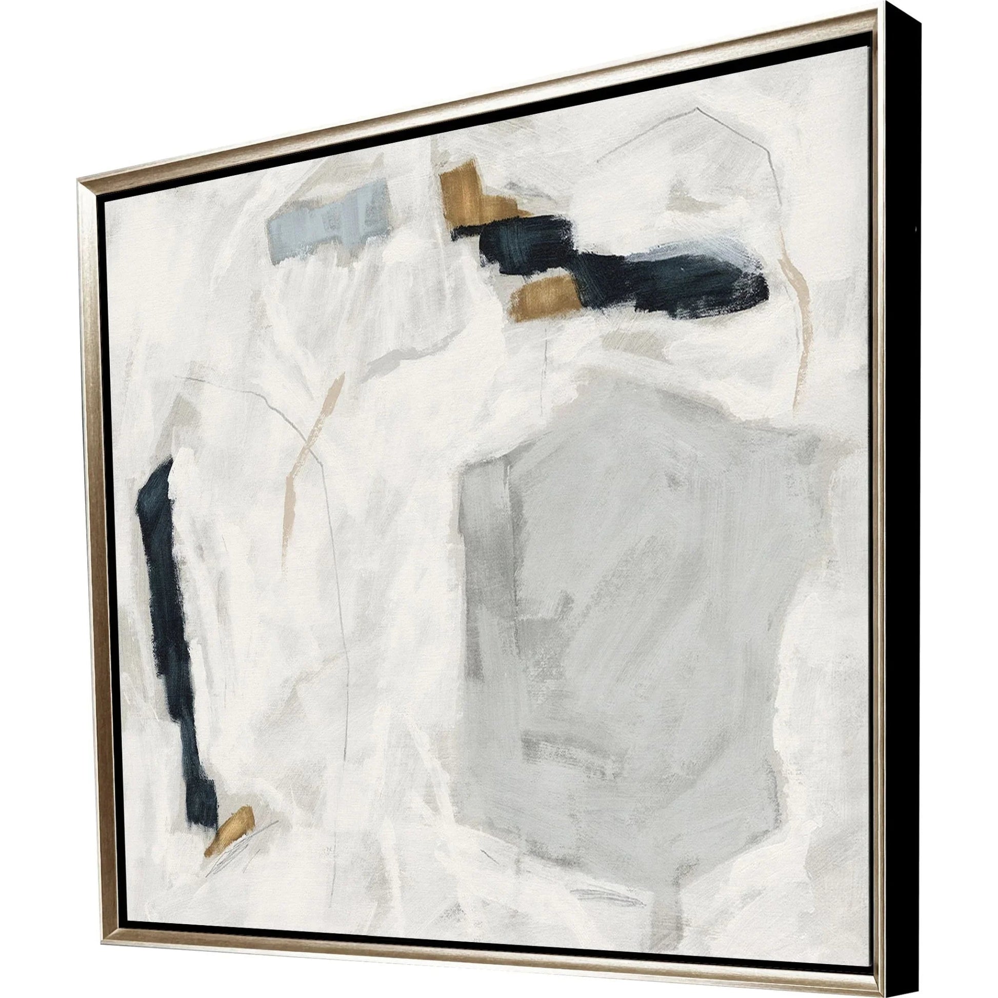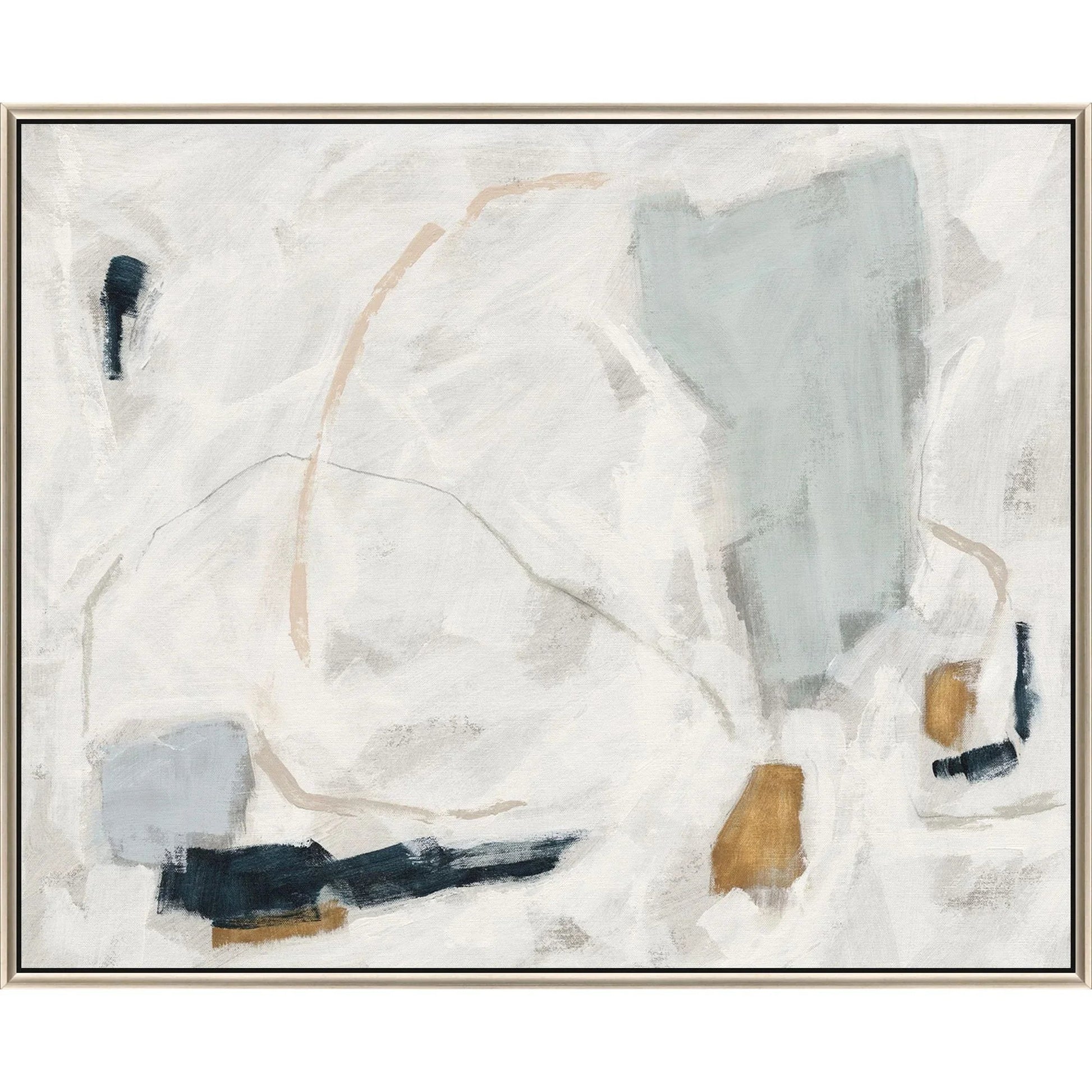 Infuse your space with a touch of elegance with this contemporary canvas art. This piece features a neutral palette with subtle blue and beige hues that blend seamlessly into a variety of interiors. The canvas is beautifully mounted in a warm silver floater frame with satin black sides, adding a sophisticated edge to any room. Whether hung vertically or horizontally, this art piece promises to become a centerpiece in your living room, bedroom, or office.