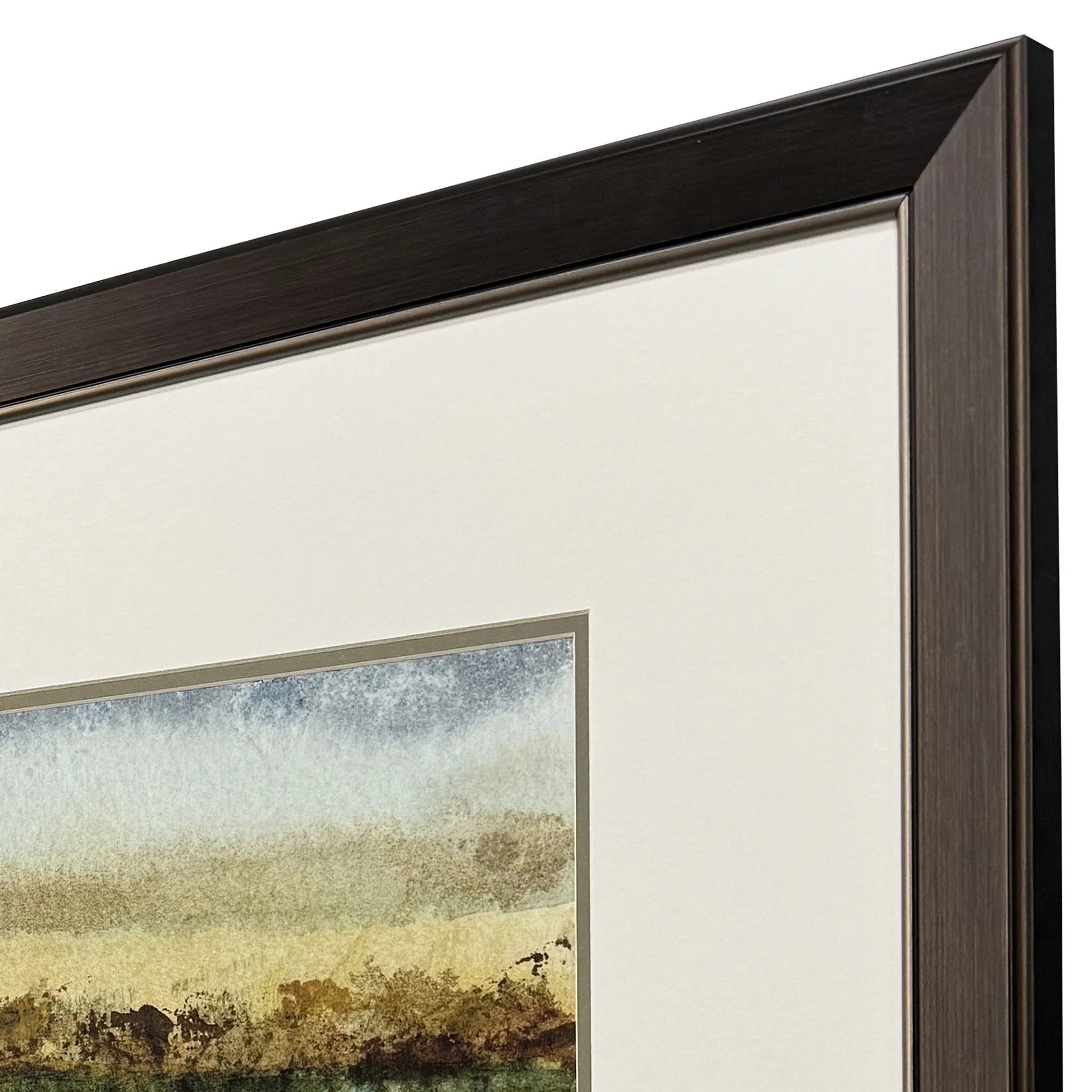 Expertly matted in white and enclosed in a dark wood frame with a metallic bronze finish and pewter lip, these pieces add a subtle elegance to your decor. The glass front not only protects the art but also enhances its visual appeal. With a transitional style, these artworks seamlessly blend with various interior themes, offering versatility and charm. Each piece is hand-assembled, ensuring a unique touch that sets this set apart from mass-produced items.