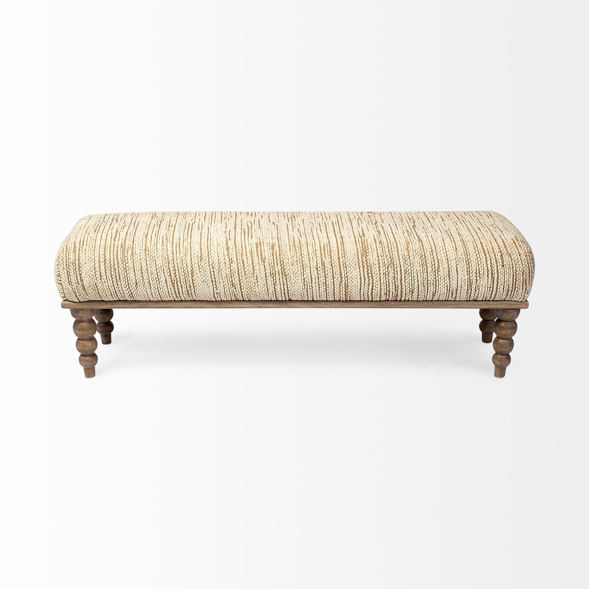 Enhance your bedroom with the Alder Cream Fabric Bedroom Bench, a blend of style and function. This bench features a plush cream fabric top that offers a comfortable seating experience. The hand-upholstered cushion adds a touch of luxury, making it an inviting spot to relax. Crafted from premium Indian mango wood, the base and frame provide a sturdy foundation, ensuring durability and stability. The four natural-brown polished, turned legs not only add to the bench's visual appeal but also contribute to its balance.