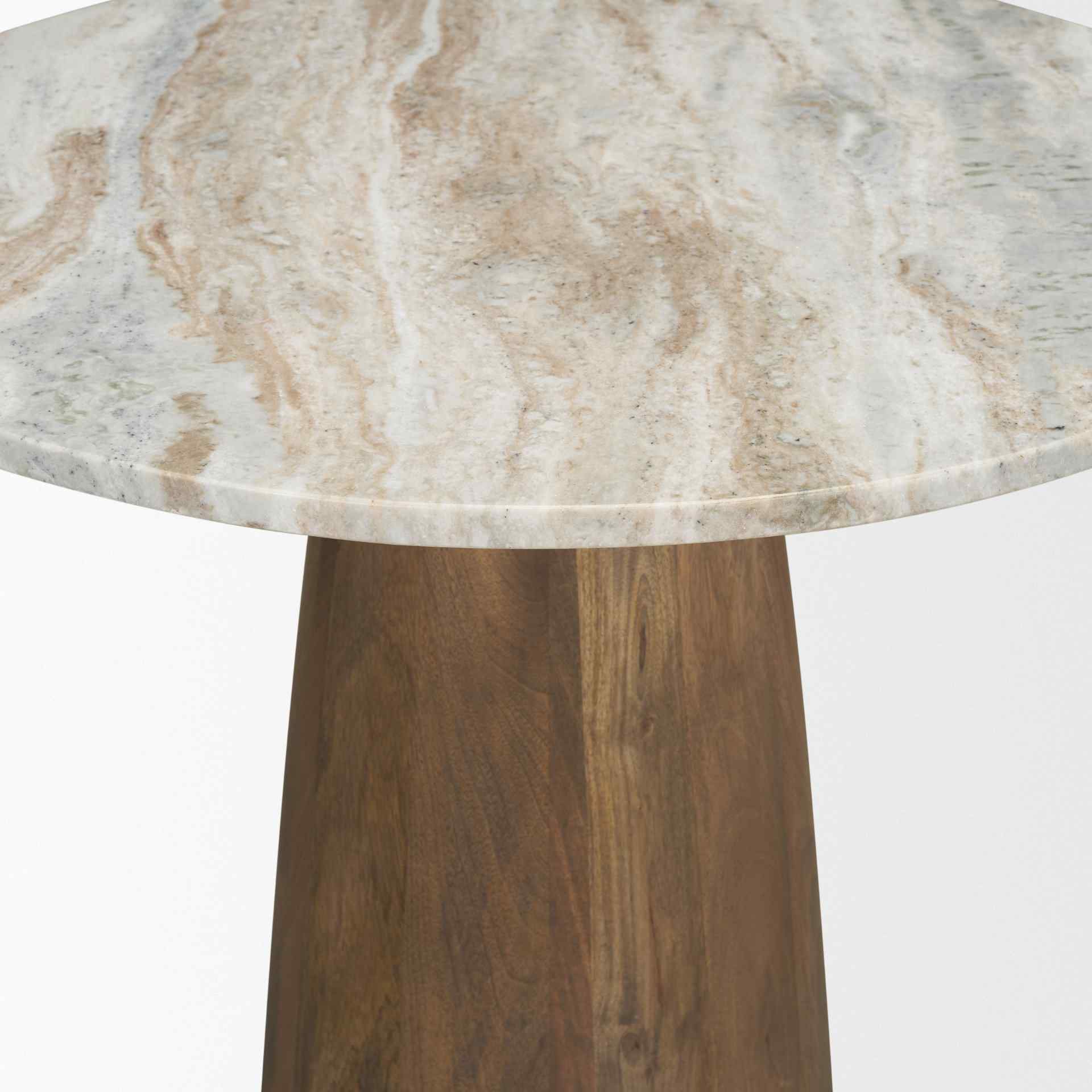 Elevate your dining space with the Allyson 32" Round Bistro Table. This piece combines a stunning pink and brown marble tabletop with a solid wood pedestal base in a medium brown finish. Each marble tabletop is unique, showcasing intricate gray and pink veining, adding elegance and a touch of sophistication to your dining area. Crafted from high-quality solid mango wood, the table promises durability along with a beautiful natural grain pattern. The gentle curves of the base complement the soft lines of the tabletop, creating an atmosphere of refined sophistication ideal for intimate dining experiences. Some assembly required.