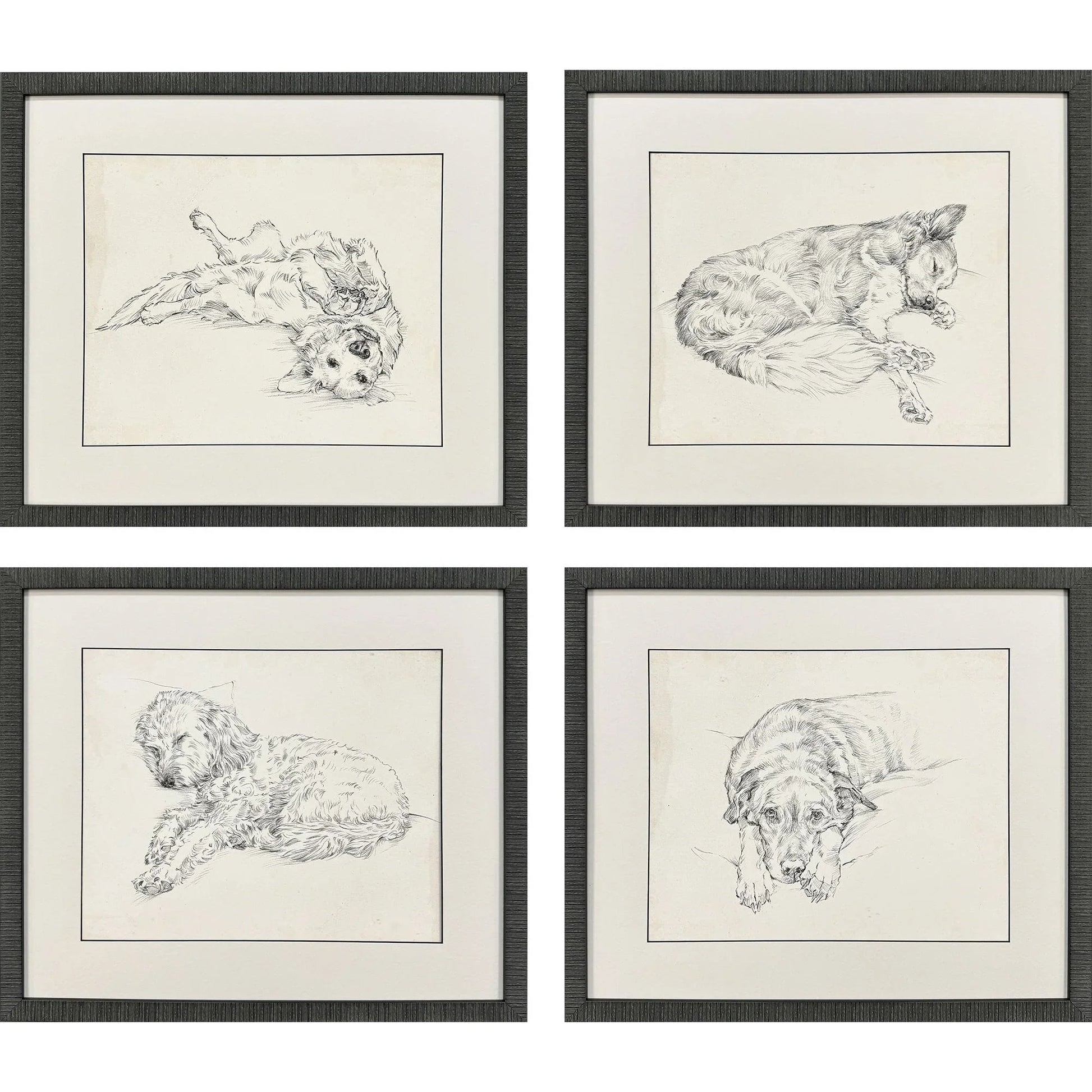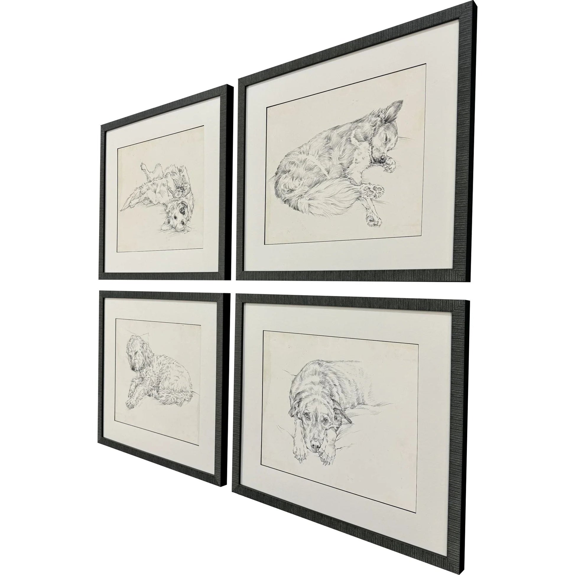 This collection of Framed Wall Art brings a touch of vintage charm to any room. Featuring four delightful dog sketches, each piece showcases the timeless appeal of traditional art. These sketches capture the essence of dogs in relaxed poses, drawn in black ink on an off-white background. The minimalist style allows the viewer to appreciate the simple yet expressive lines that bring these lovable canine characters to life. The distressed black finish on the frame, enhanced with a subtle gray wash and black side, complements the overall look, making it suitable for any traditional or modern decor. This set is ideal for dog lovers looking to add a touch of nostalgia to their living space.