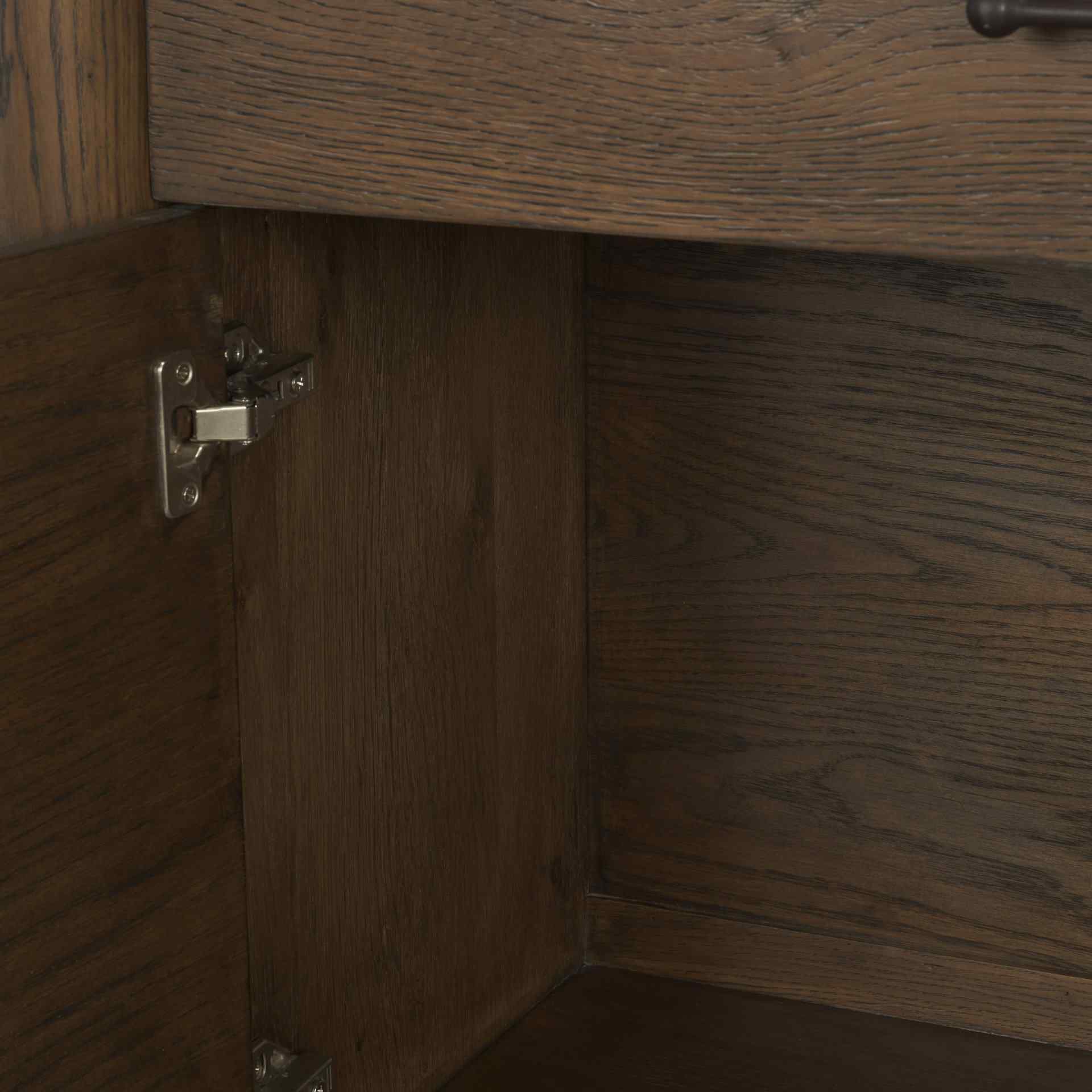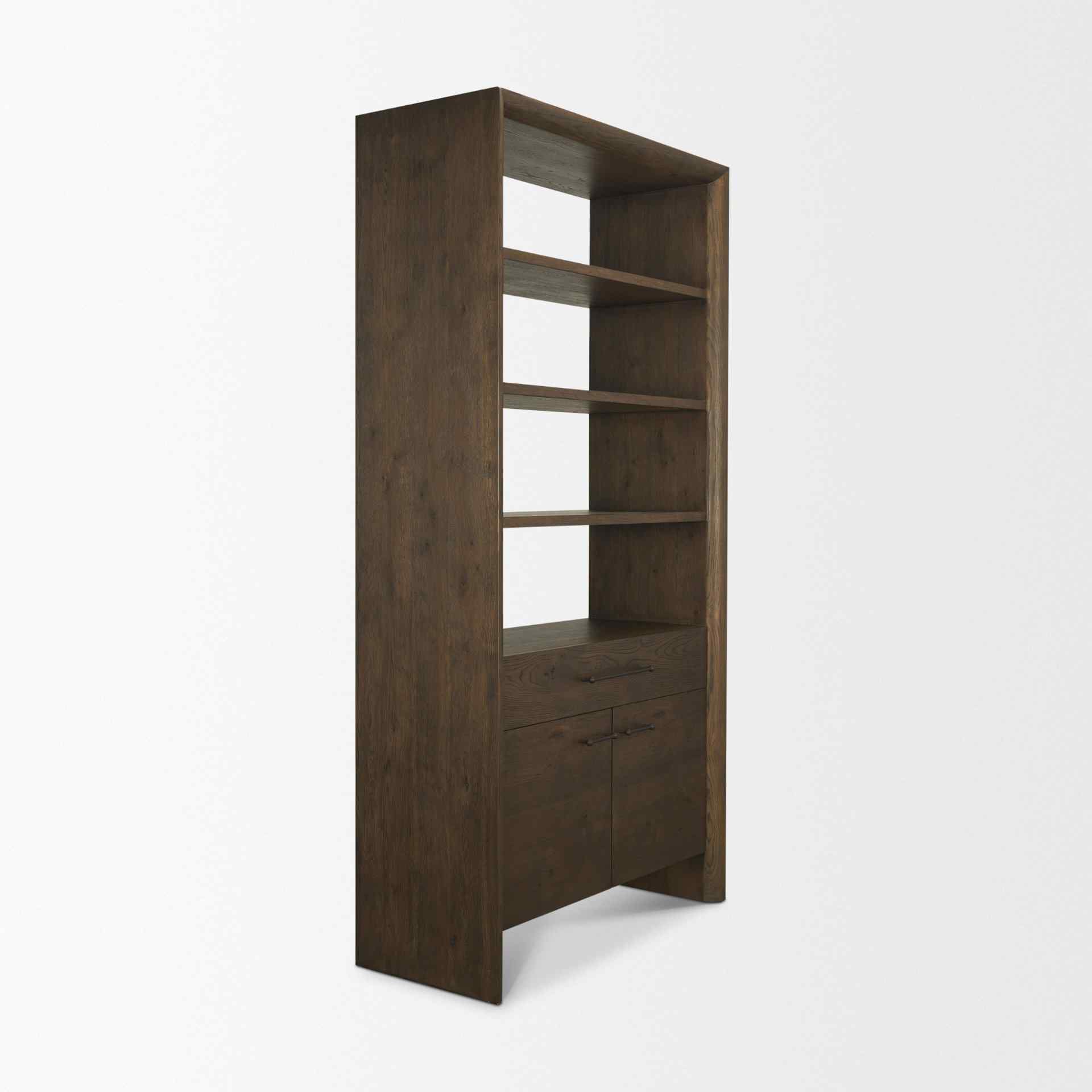 The Belford 2-Door Oak Shelving Unit With Open Design offers both style and function for any space. Made from a blend of solid rustic oak and oak veneer, this unit showcases a dark brown finish with a rough wire-brushed texture that highlights the wood's natural beauty. Designed with versatility in mind, it features a single drawer, two cabinet doors, and an open shelf, providing ample storage and display options. This piece is perfect for living rooms, offices, or any area in need of multipurpose storage. Its open design adds a modern touch, making it a valuable addition to any home.