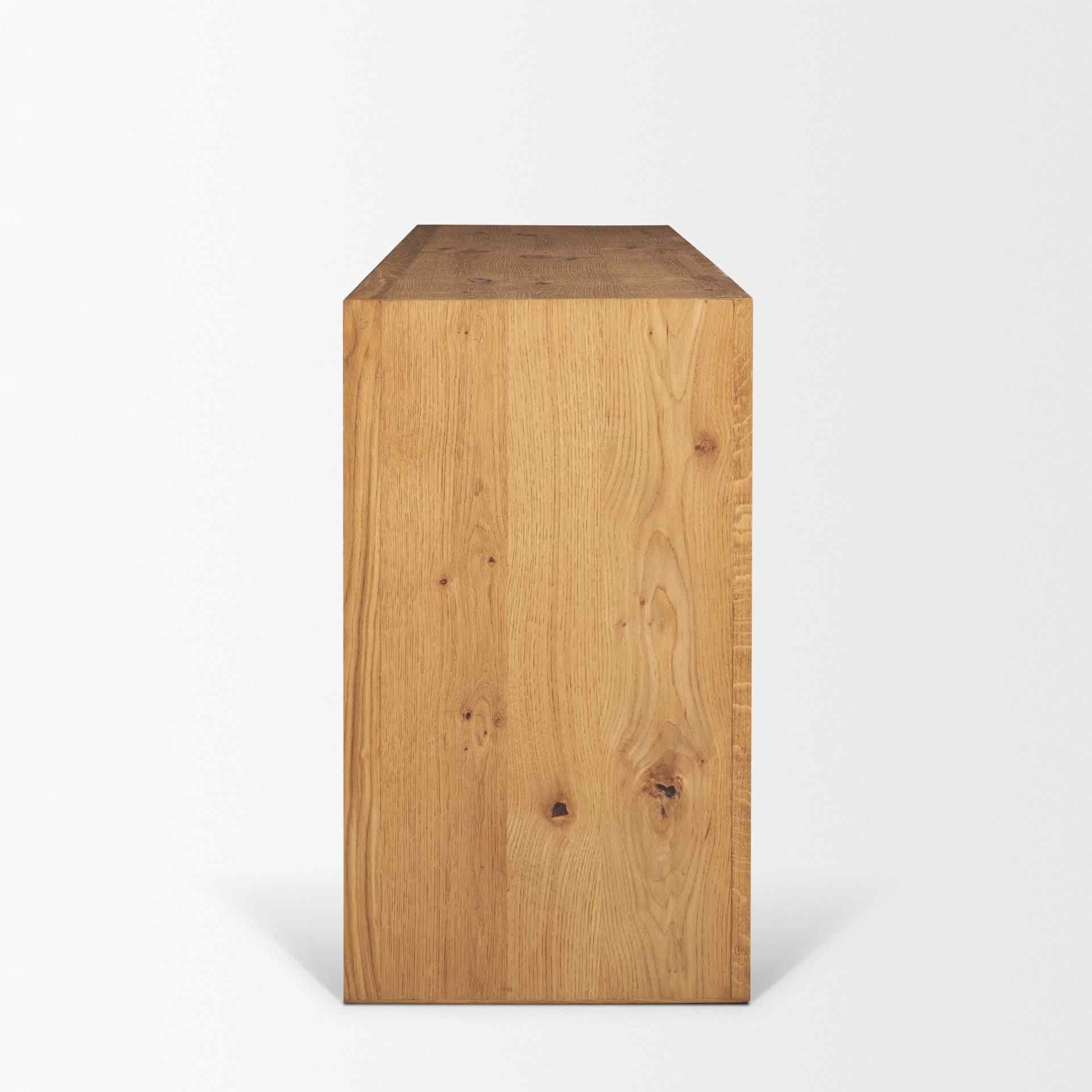 - Material details: Crafted from solid oak wood and grain-matched oak veneer, with a light brown wire-brushed textured finish