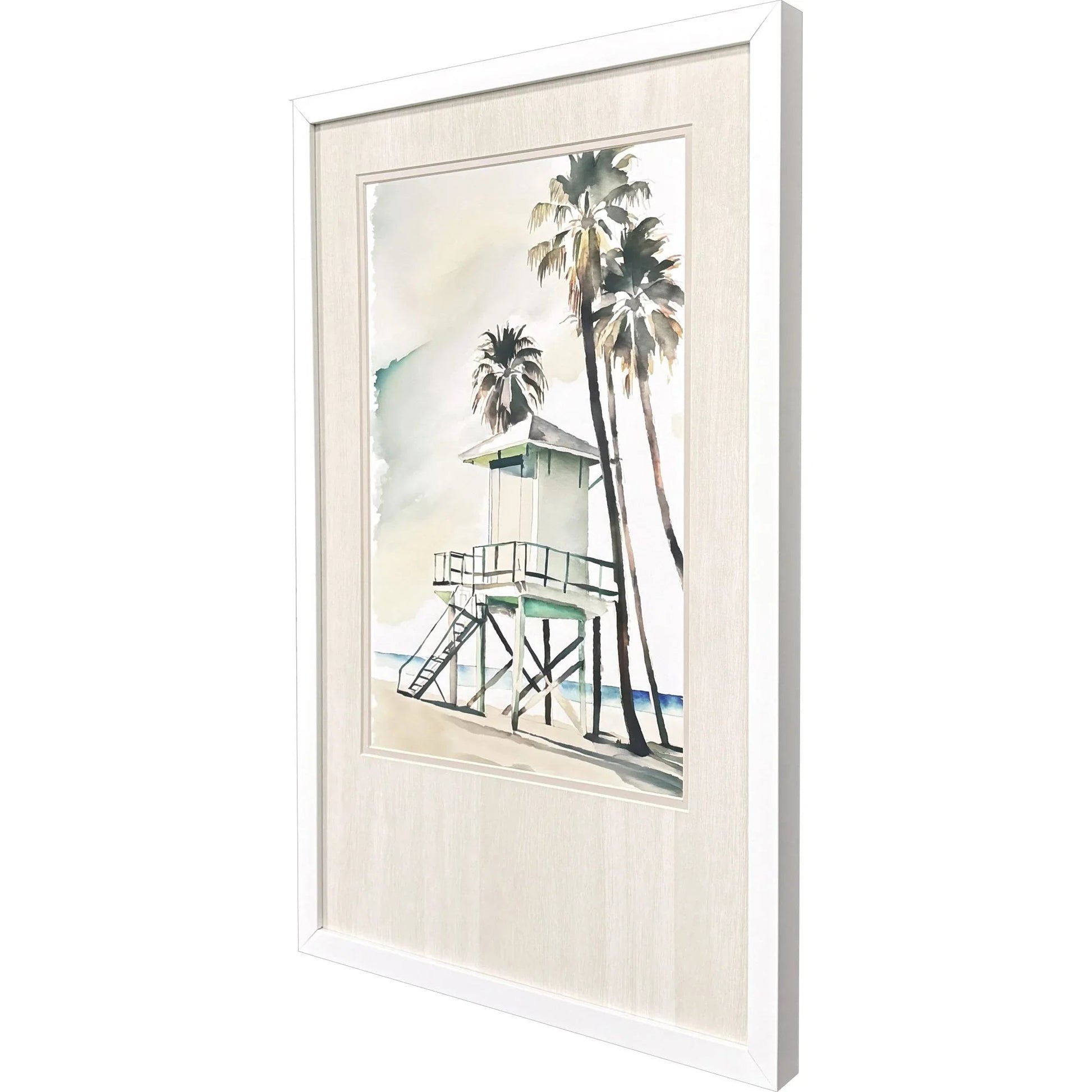 Bring the serene beauty of the coast into your home with this stunning artwork. Featuring a watercolor painting of a lifeguard tower surrounded by palm trees, this piece captures the essence of a calm beach setting. The soft pastel colors of blue, green, and beige are beautifully offset by premium matting, adding depth and dimension to the piece. The artwork is framed in a modern flat profile moulding with a matte white finish, making it a versatile addition to any room with a coastal theme.