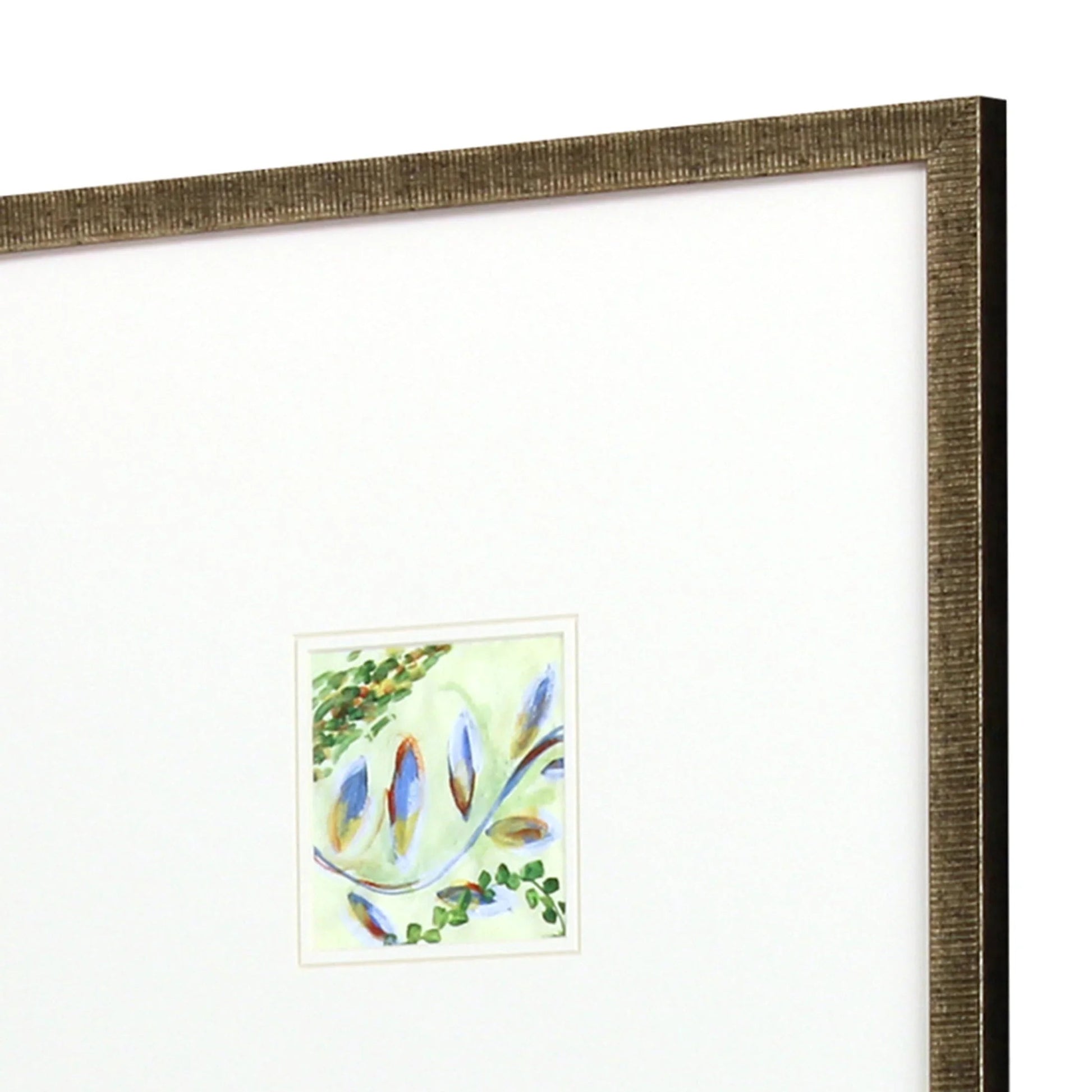 Enhance your living space with this stunning collection of four botanical prints. Each artwork in this series adds a touch of nature's beauty to any room. The vivid colors of orange, blue, green, and yellow bring life to these abstract leaf designs. These pieces are set against extra-wide white matting, allowing each color to pop brilliantly. The ribbed moulding of the frames has a distressed antique gold finish, giving a touch of elegance and sophistication to your walls. This collection offers a unique way to enjoy the beauty of nature indoors.