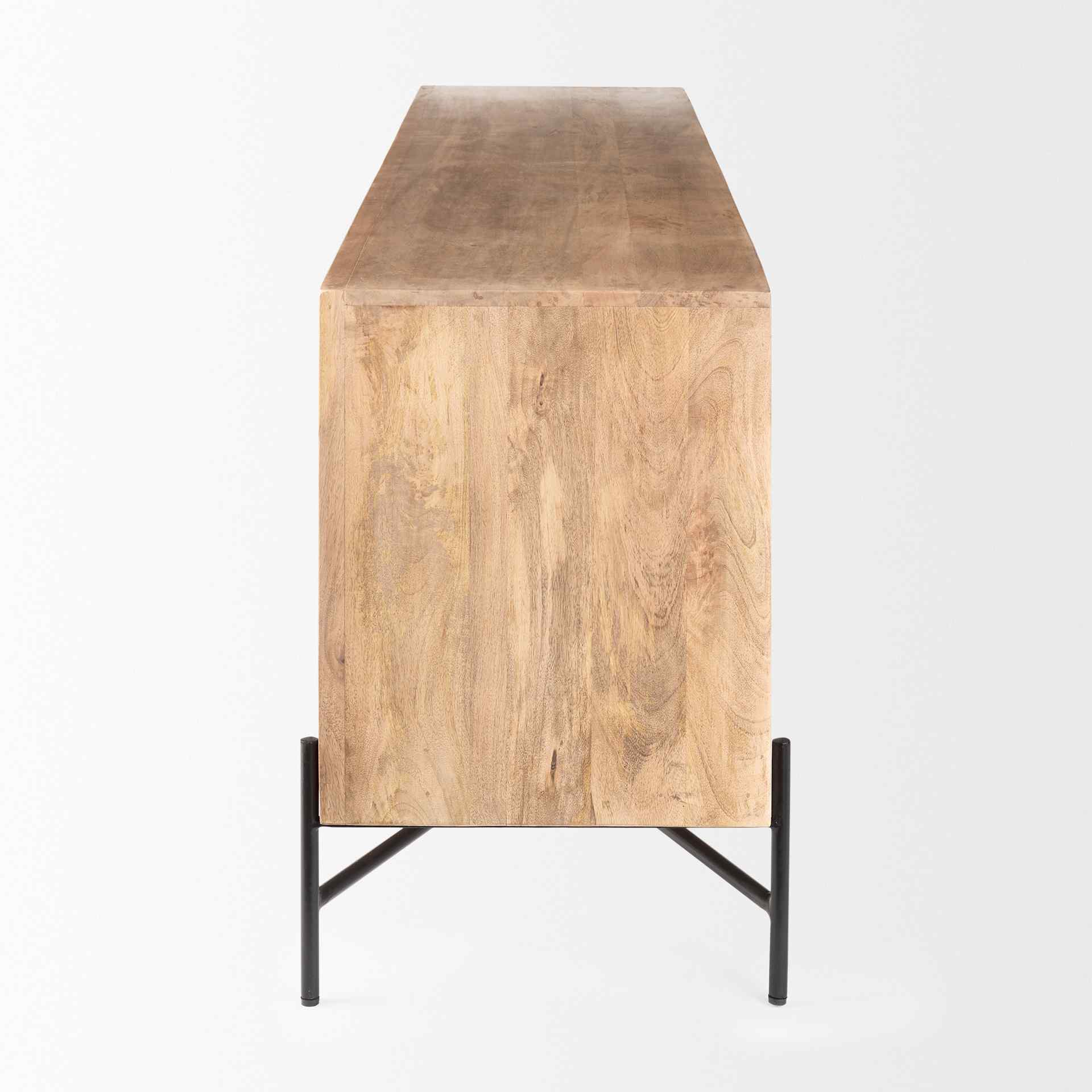 Crafted from high-quality Indian mango wood, this sideboard is a standout piece for any home. The light brown finish enhances its natural beauty, while the intricately carved square patterns on the four doors add a touch of elegance. Perfect for those who appreciate tropical and coastal designs, its sleek silhouette and clean lines make it a versatile addition to any room. The matte-black iron frame not only provides stability but also complements the overall look, making this sideboard not just a storage solution but a focal point in your dining area.