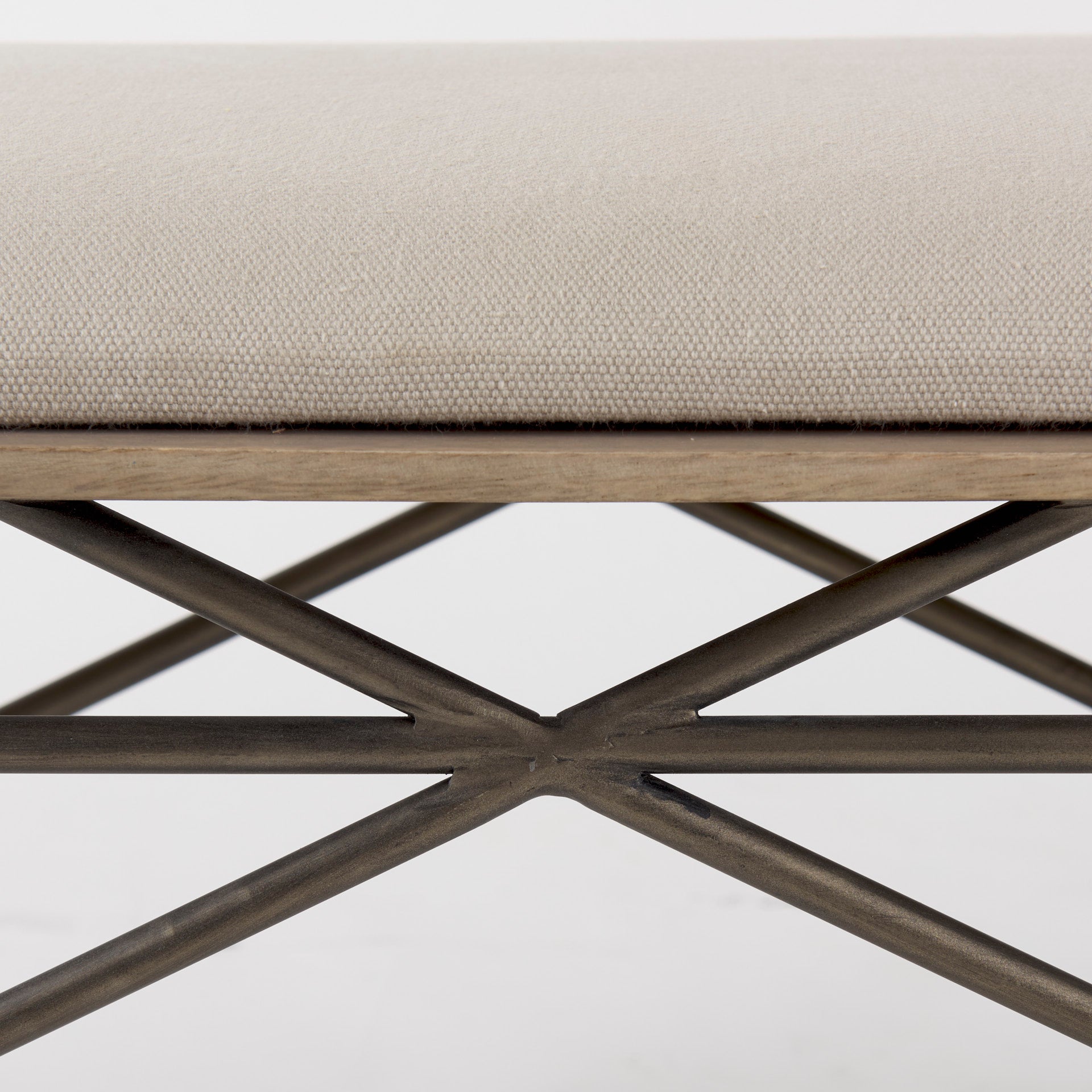The Camille Cream Fabric Bedroom Bench adds a touch of elegance to any room. Crafted from plush fabric, this bench offers a soft and inviting seat. The light cream color of the fabric pairs beautifully with the contrasting dark metal frame, creating a sophisticated look that complements both contemporary and classic decor styles. Its sleek rectangular shape and crisscross metal support design enhance its modern appeal, making it an ideal addition to bedrooms, living rooms, or entryways.
