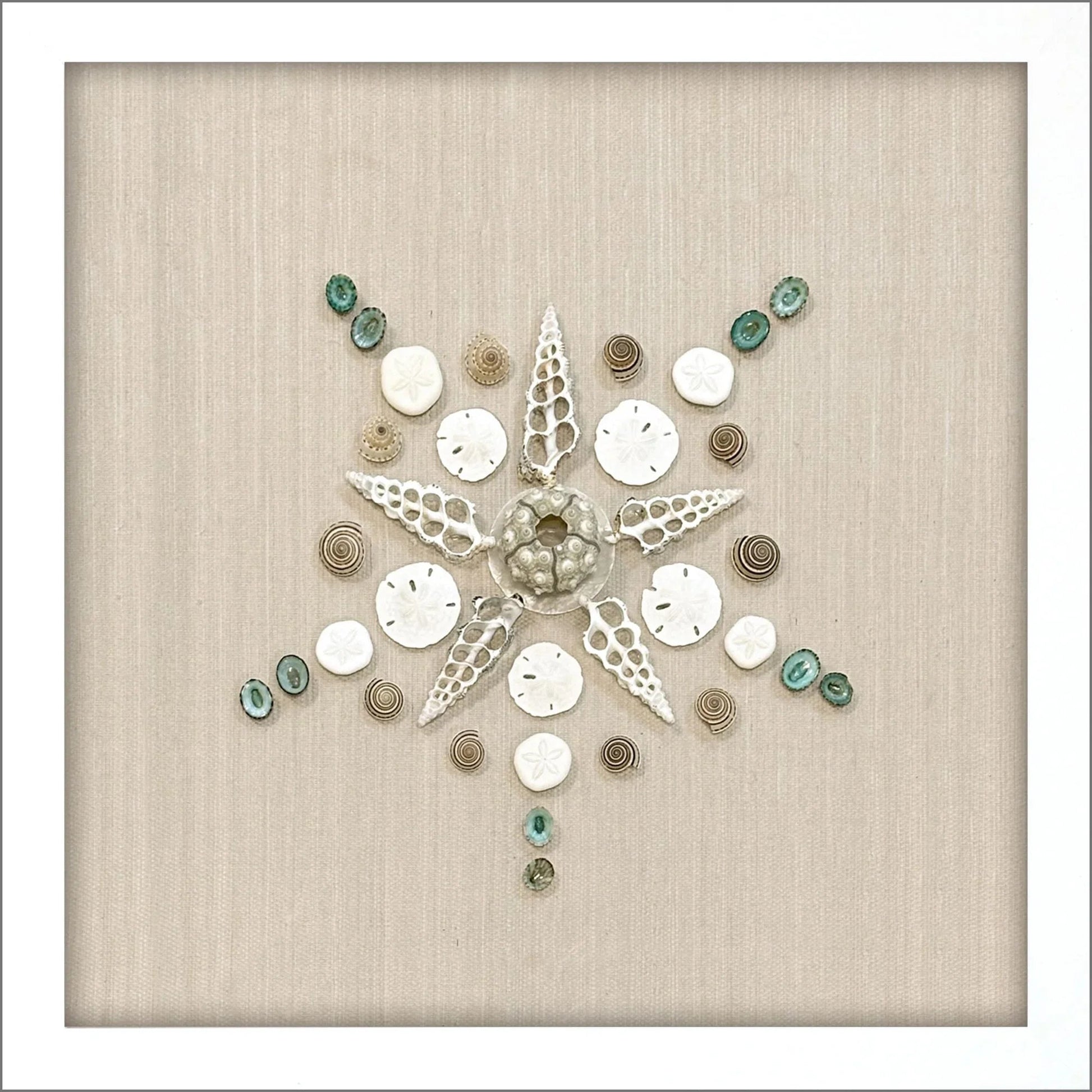 The Caparazon I and II Coastal Art Exclusive Hand Finished Decor brings the serene beauty of the ocean into any living space. Its unique design features hand-mounted seashells arranged in a starburst pattern, accented with decorative paper for an artistic touch. The natural tones of the circular and spiral shells are complemented by a beige canvas background, highlighted with subtle white and teal accents. This piece is set within a white lacquered wood shadow box style frame, offering a clean and modern look that fits seamlessly into coastal-themed decor.
