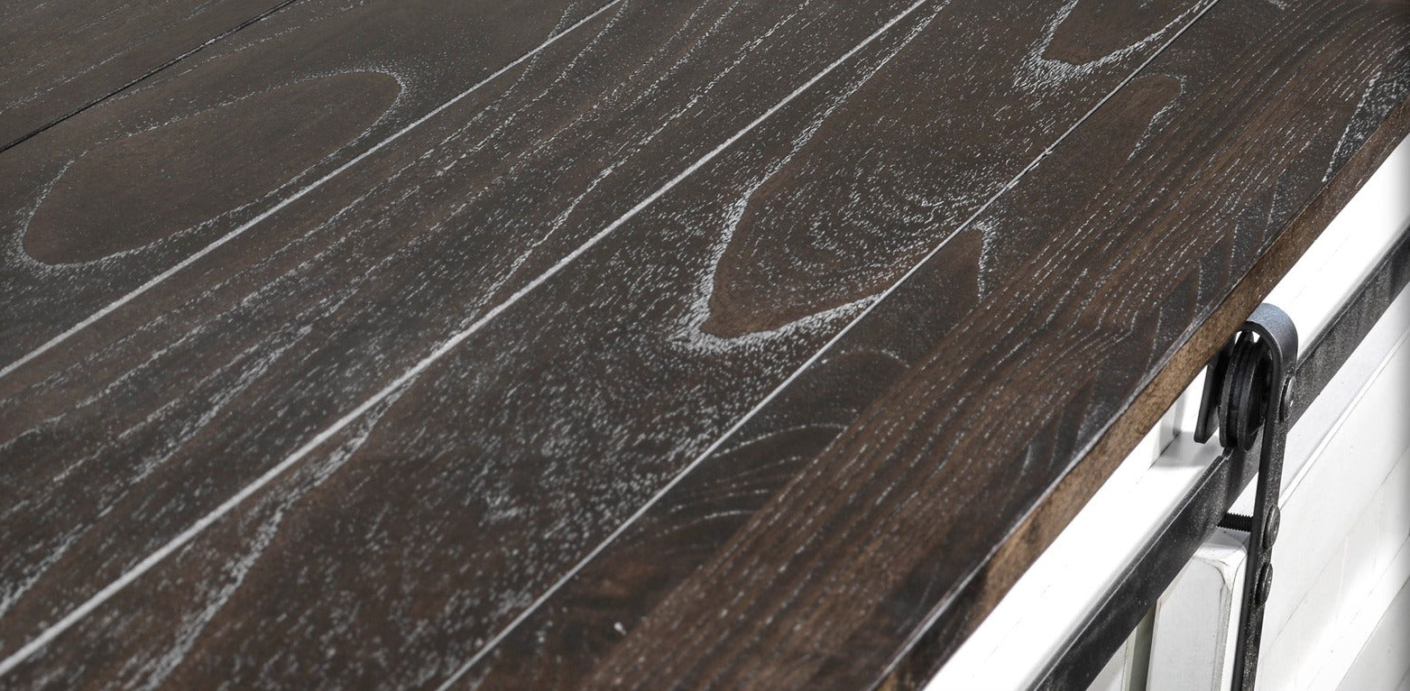 Enhance your living space with this modern entertainment stand. Crafted from mahogany, the Carriage House TV Console adds a touch of farmhouse style to any room. The white and medium brown finish, accented by a two-tone white and brown design, effortlessly complements existing furniture. This console features sliding barn doors with metal hardware, providing both style and function. Behind these doors, you'll find a removable shelf to organize your electronics or decor items. Cutouts in the rear make cord management a breeze, keeping your space tidy and clutter-free. With no assembly required, you can enjoy this stylish piece right out of the box.