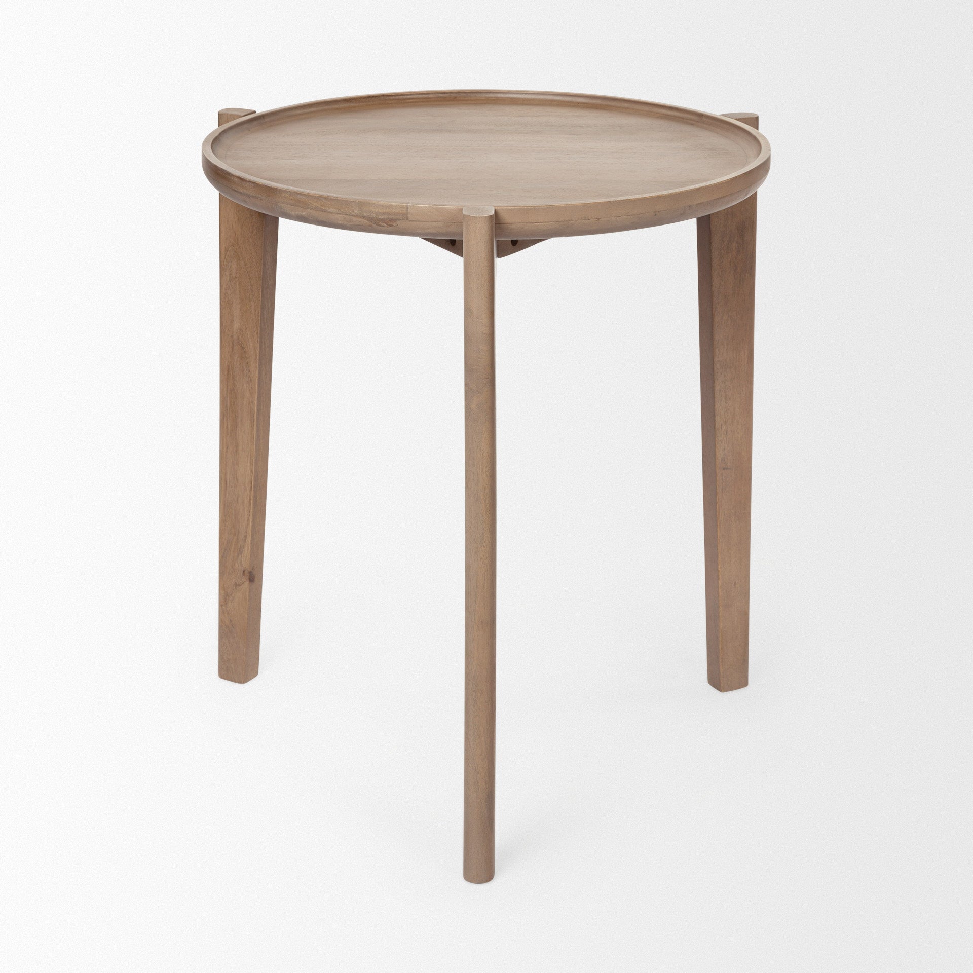 The Cleaver Wood Top Accent Table is a stylish addition to any modern living room. With its round top and lipped edge, this table offers both elegance and practicality. Made entirely from solid Mango wood, it boasts a smooth texture and soft brown finish that effortlessly complements most color palettes. The three-legged design provides stability and enhances the table’s visual appeal, making it a standout piece in any setting. Whether you're looking to add a touch of sophistication to your living room or need a versatile table for different spaces, this accent table fits the bill.
