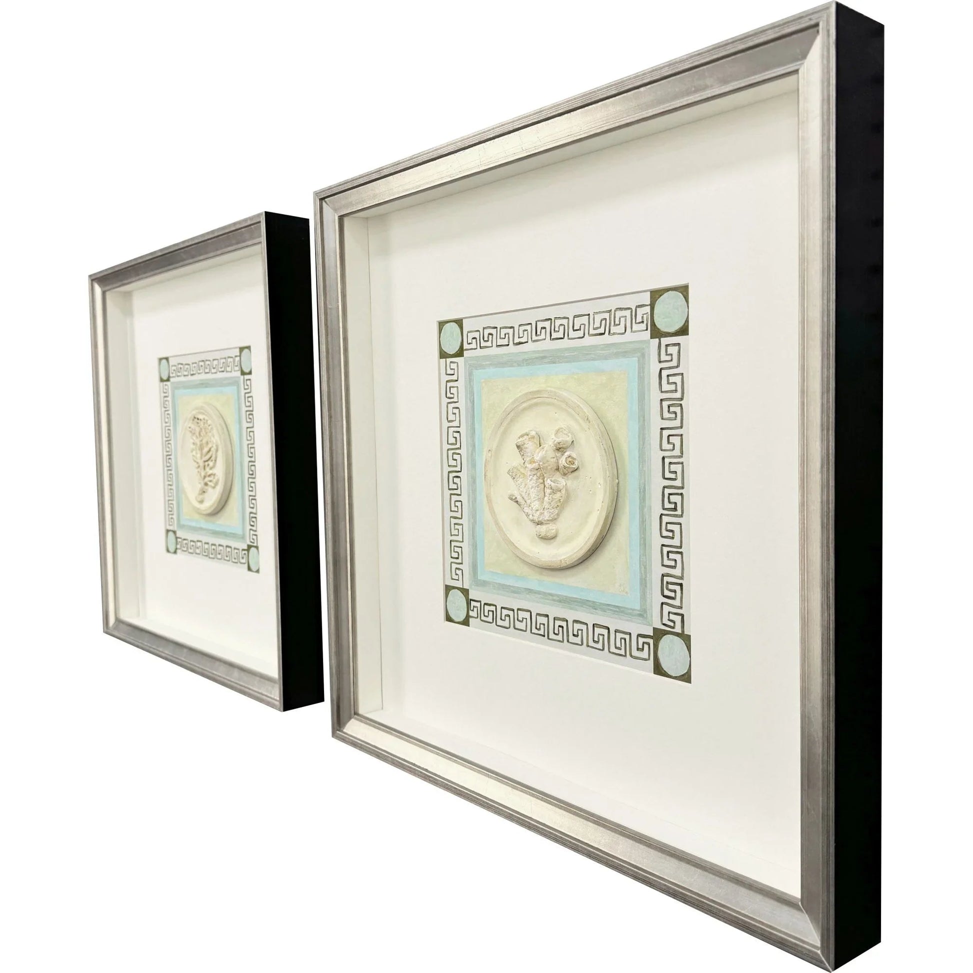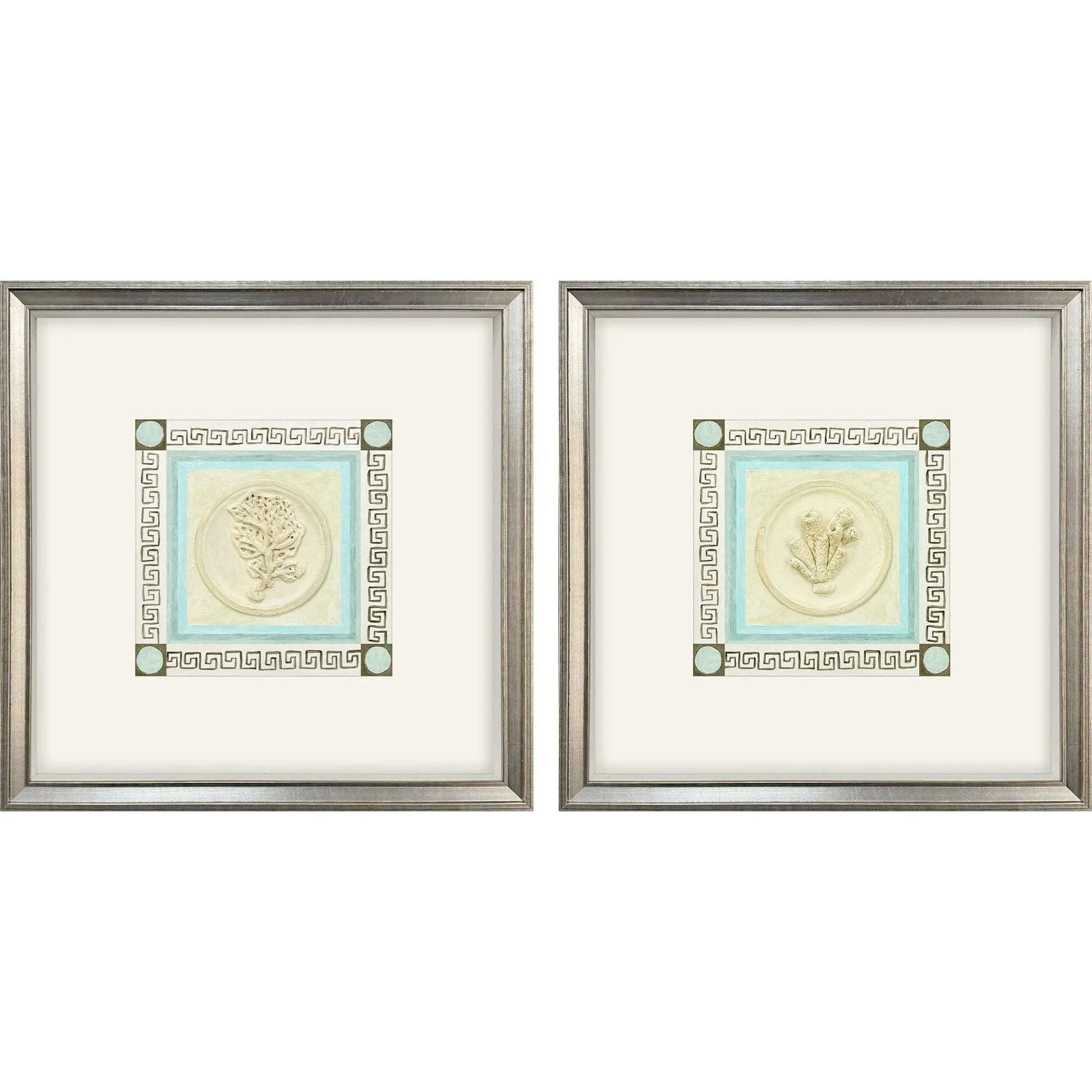 Transform any space with the Coral Circles II S/2 Exclusive Hand Finished Art Set. This elegant art set features hand-cast intaglios that capture coral specimens against a lively classical background. The artwork is beautifully showcased with white matting and shadow boxed in a silver leaf wood frame. The coastal style brings a touch of the sea into your home, making it perfect for those who appreciate the serenity and beauty of the ocean. The beige background complements the central medallion's floral design, highlighted by the light blue and brown geometric border, adding depth and sophistication.