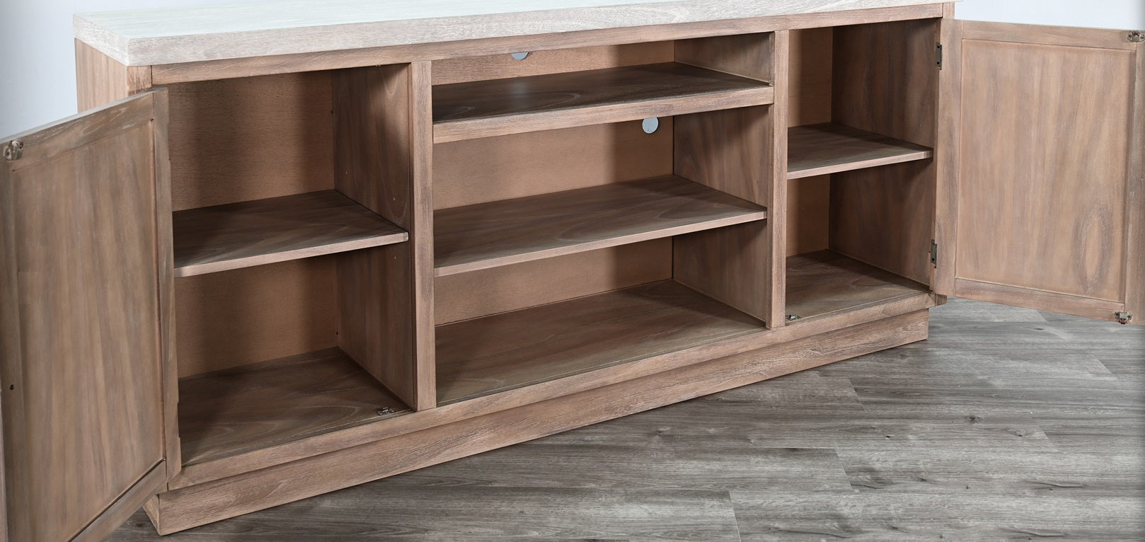 78" Coral Shore Media Console With Rustic Charm And Ample Storage Features: