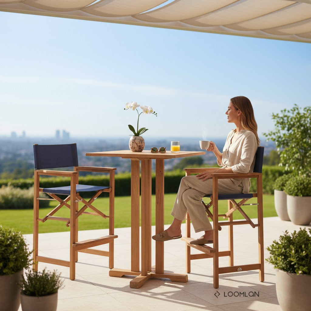 The Director 3-Piece Bar Set is an ideal choice for enhancing narrow balconies or poolside areas. Crafted from premium teak wood, the set ensures durability and timeless elegance. The sturdy table is complemented by two folding armchairs, offering a perfect blend of function and style. The chair frames are crafted from teak, paired with a resilient sling fabric for the seat and back, making them suitable for outdoor use. With its sleek design and robust construction, this set fits seamlessly into any outdoor decor, providing a comfortable space for relaxation or entertaining.
