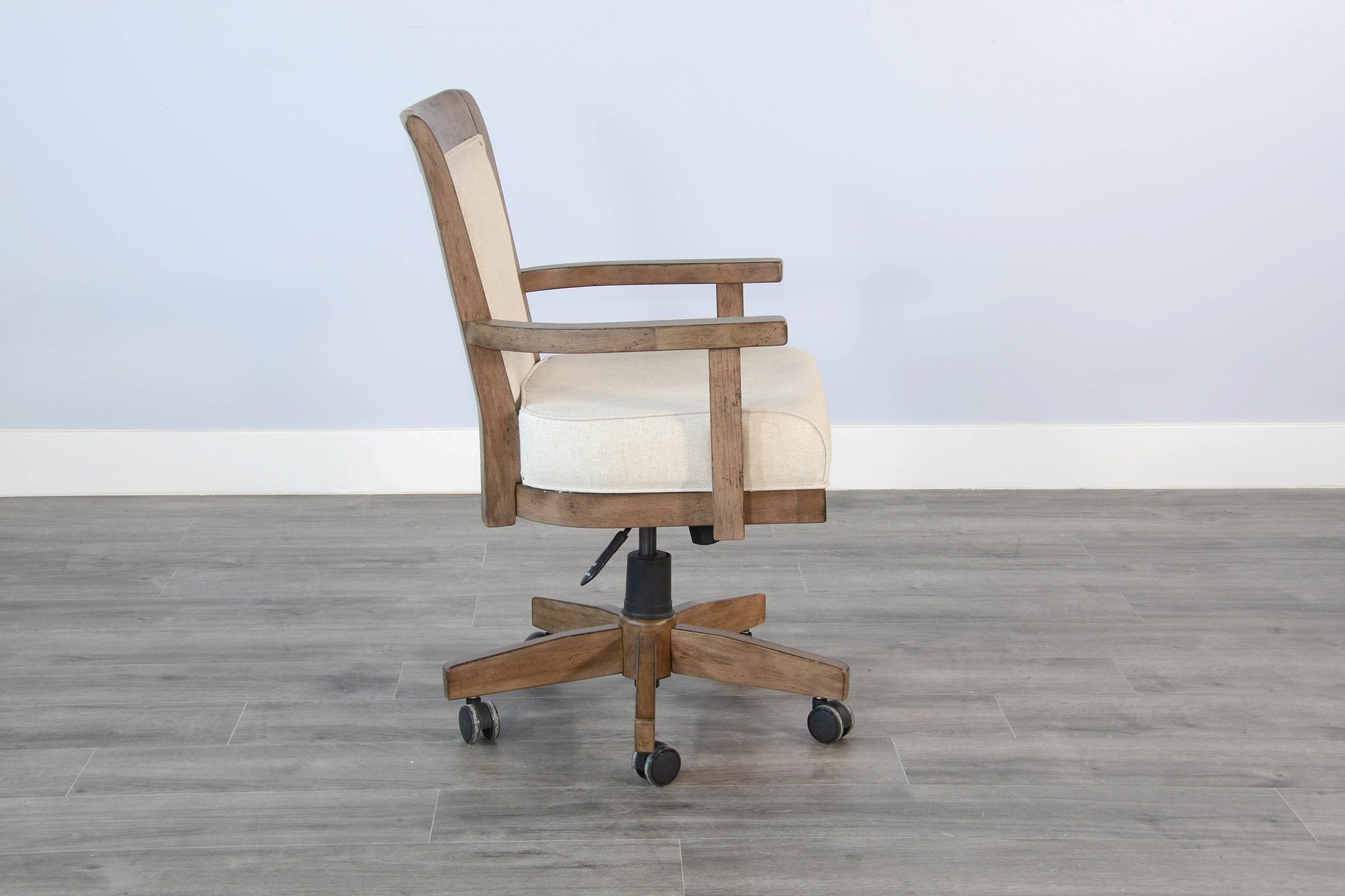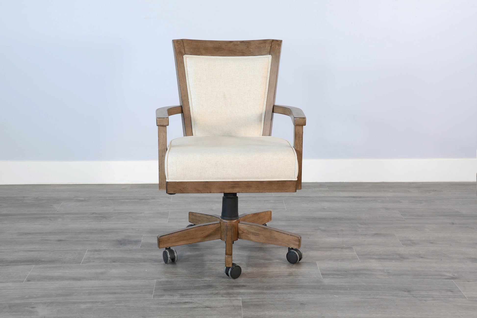 Made from durable rough-sawn mahogany solids and veneers, the Doe Valley Game Chair with Casters combines strength and style. With its traditional design, this chair features a five-star base with casters for easy movement. The chair is upholstered in a soft beige fabric that adds a touch of elegance to any room. It offers a tilt and lift function, allowing you to adjust the seat from 20 to 24 inches high, ensuring maximum comfort for long gaming or leisure sessions. Enhance your space with this adaptable chair that brings both functionality and comfort to your home.