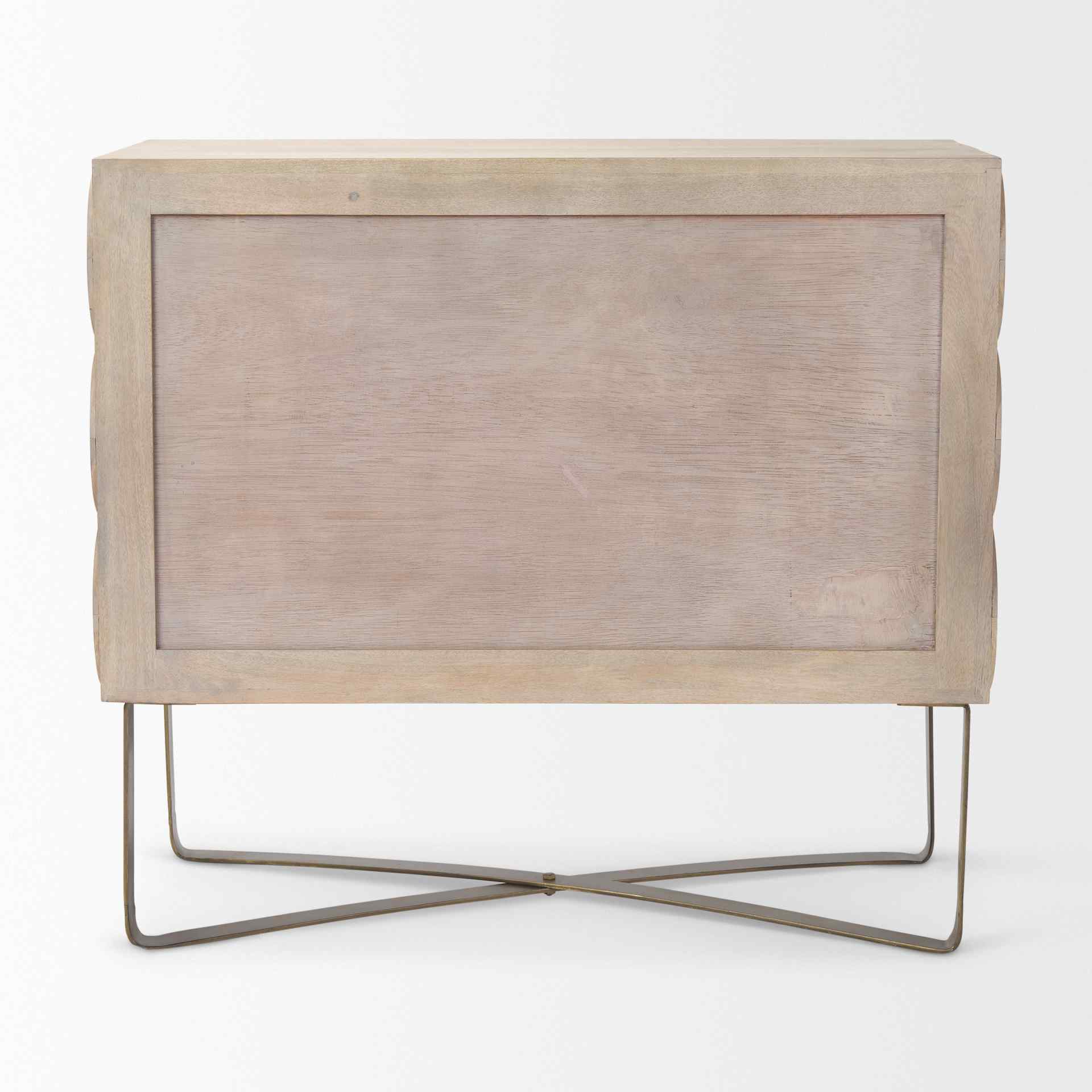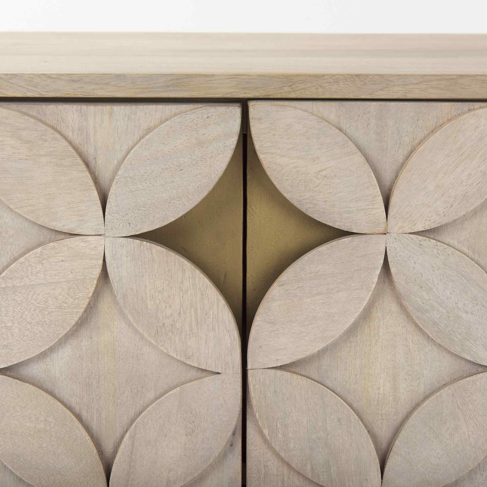 The Excelsior Two Doors Wooden Accent Cabinet is a captivating piece that adds a touch of elegance to any modern home or office environment. Crafted from golden mango wood, its standout feature is the glamorous star-in-circle, raised pattern that immediately draws attention. This intricate design is not only visually appealing but also represents the cabinet's durability and fine craftsmanship. The cabinet's two doors open to reveal ample storage space, complete with removable shelves, providing a practical solution for organizing essentials. Its sturdy construction is complemented by an iron base finished in antique gold, adding to its overall stability and aesthetic appeal.