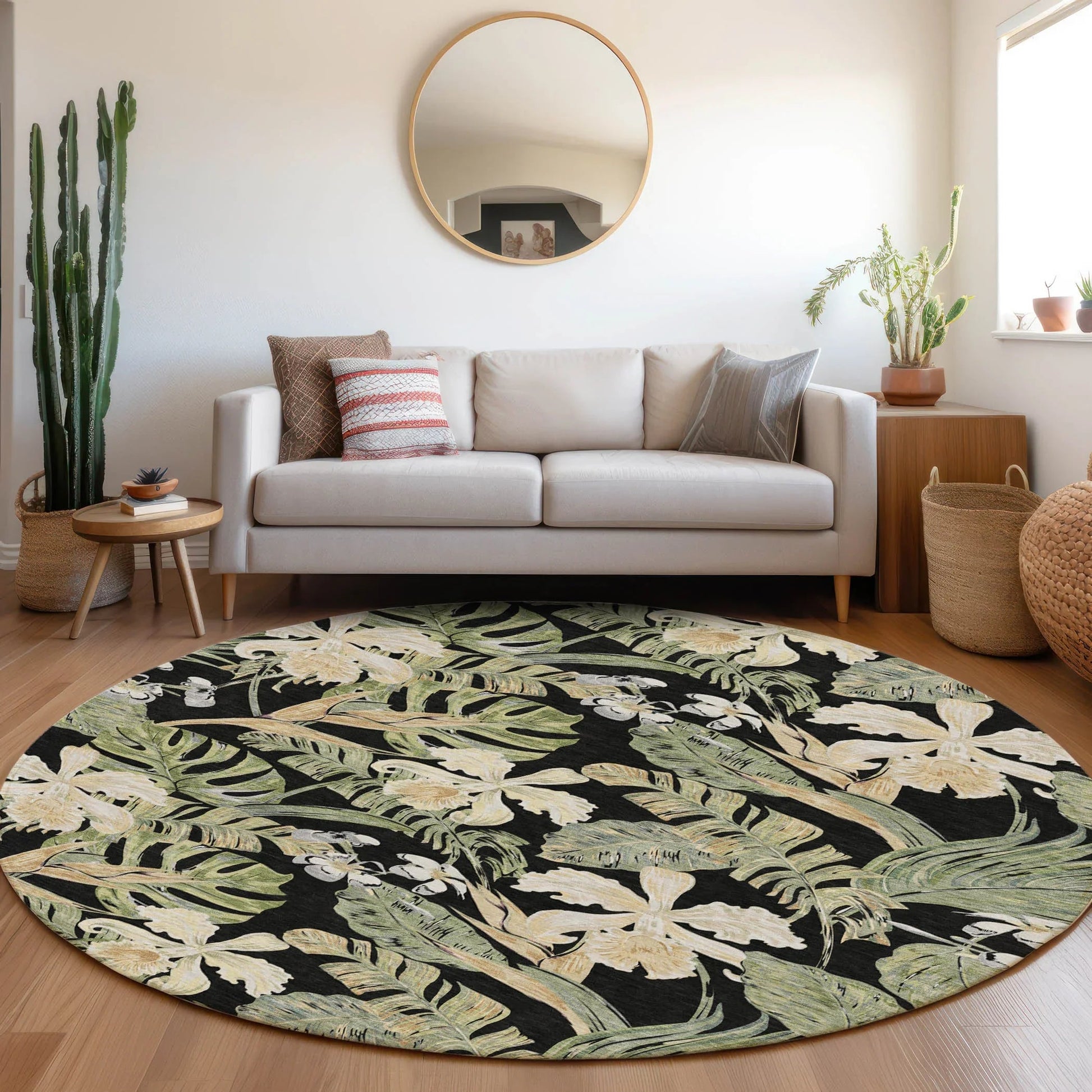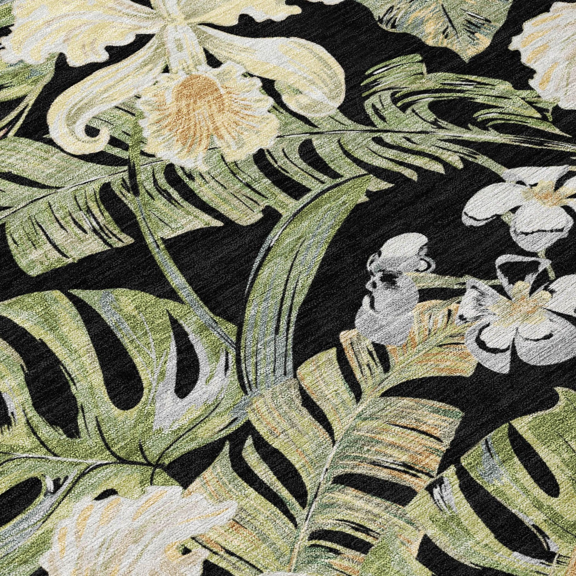 Introducing a perfect blend of style and functionality, this rug showcases a striking tropical leaf and palm design. It brings a splash of nature's beauty into any room, creating a peaceful yet chic atmosphere. Ideal for transitional spaces, the floral pattern adds an exotic touch, making it a standout piece in any setting. The black color enhances its elegance, ensuring it complements a wide range of decor styles. Whether used indoors or outdoors, this rug's design offers a unique charm that is bound to capture attention.