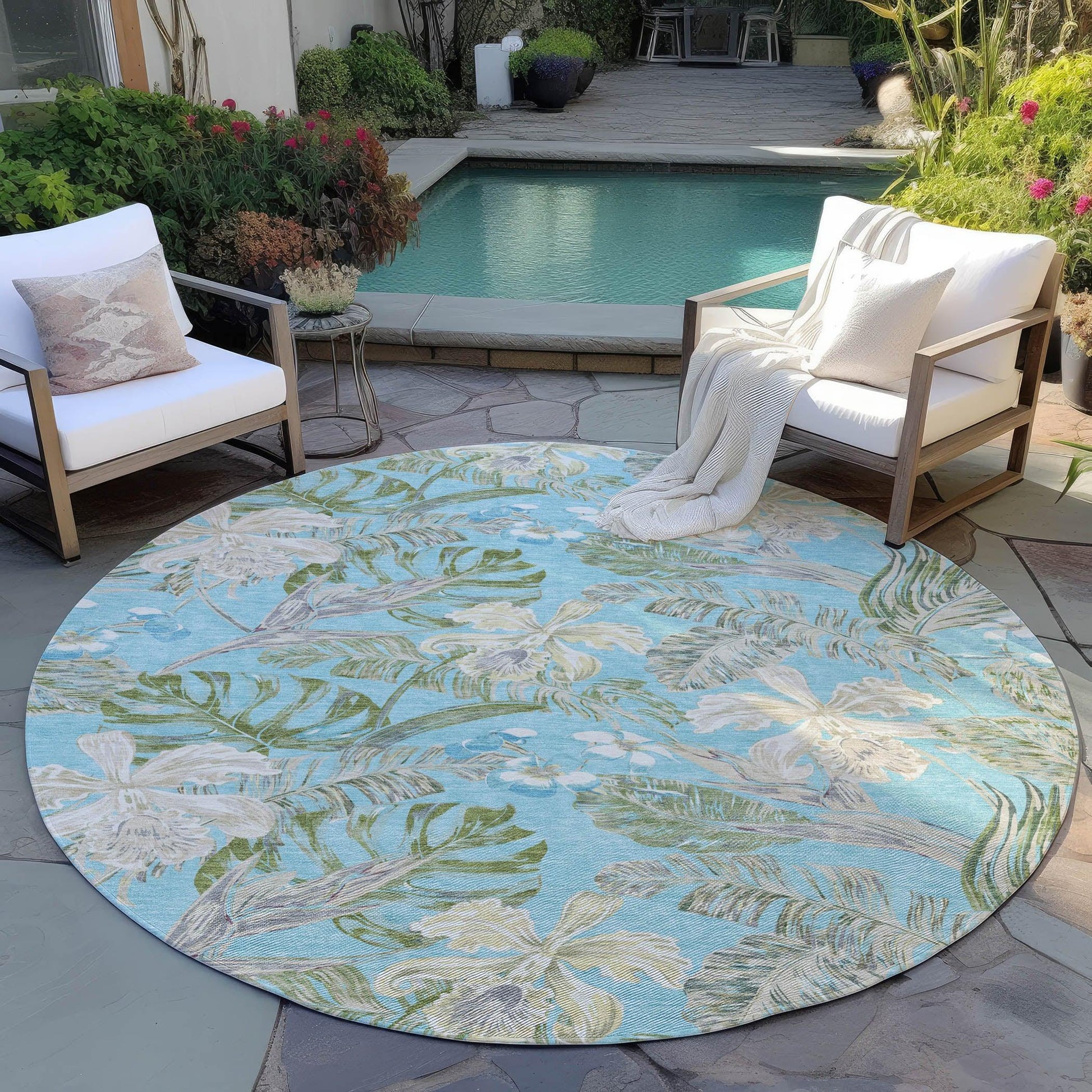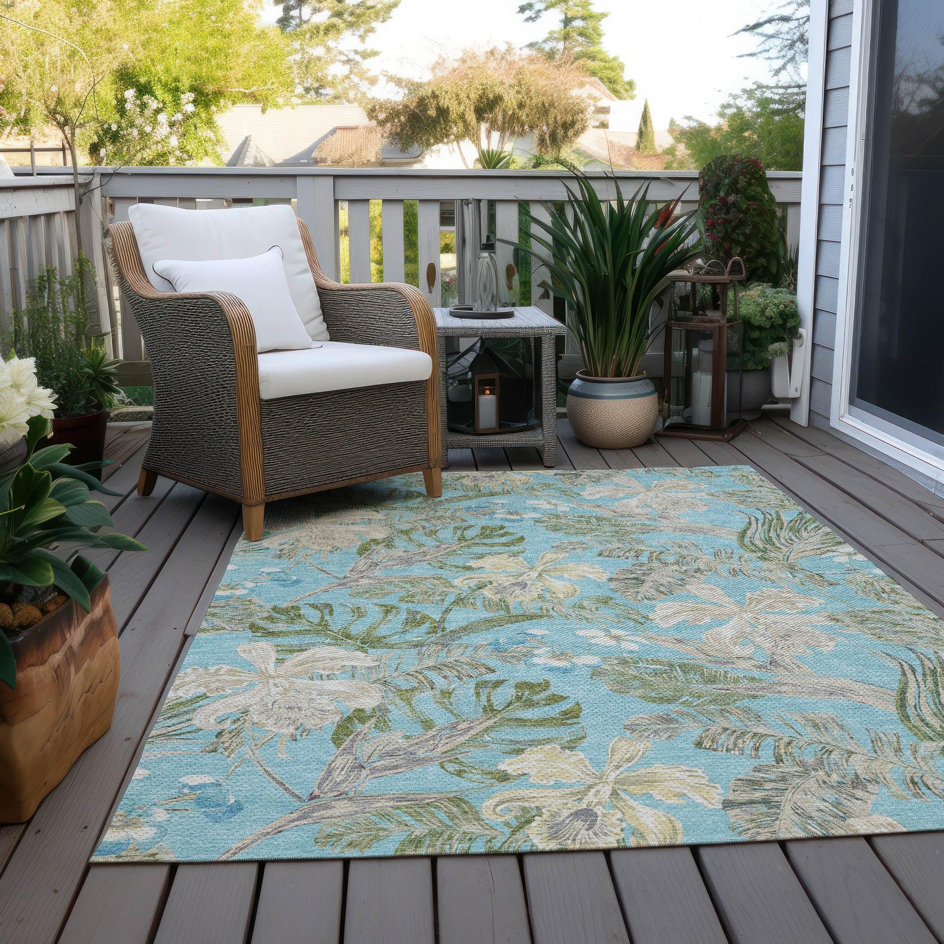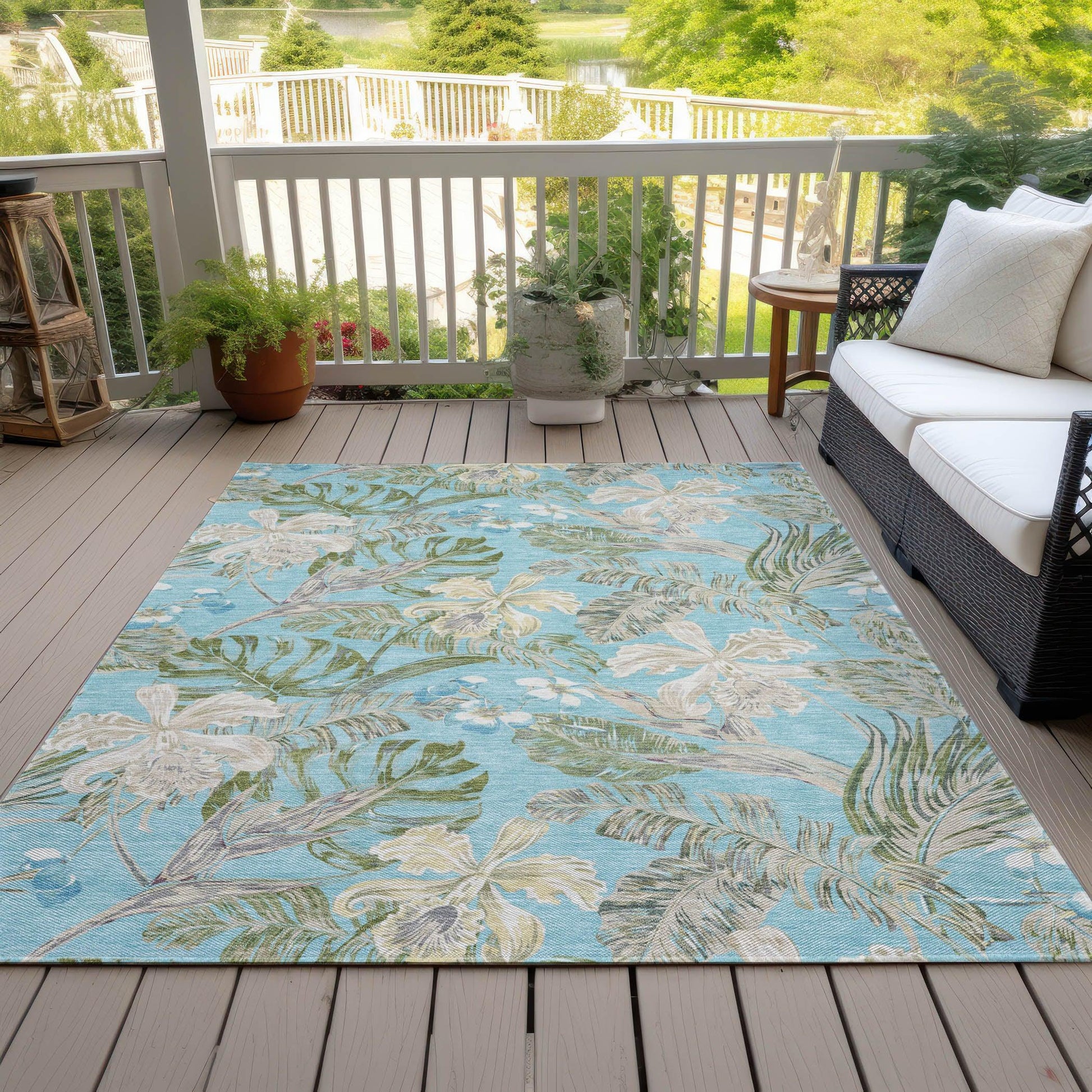 Introducing a vibrant addition to any space, the Faereth Teal Washable Indoor-Outdoor Rug is designed with a striking floral pattern that captures the essence of tropical beauty. With its eye-catching teal color, this rug brings a touch of elegance and a splash of color to any room or patio. The pattern of leaves and palms creates a soothing, nature-inspired atmosphere, perfect for both transitional and contemporary interiors. Its engaging design not only enhances the visual appeal of your space but also adds a layer of comfort underfoot.