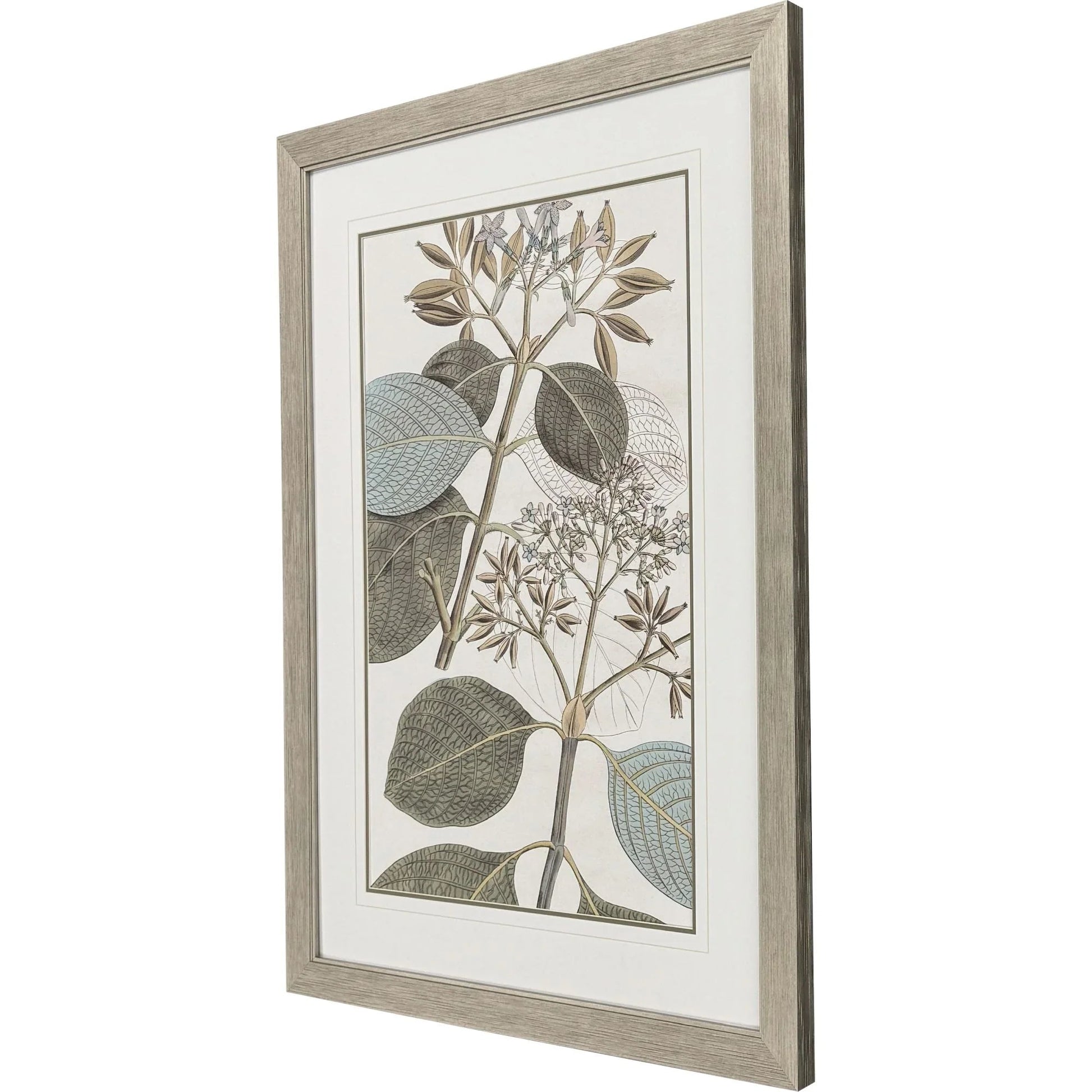 This wall art piece brings the beauty of nature into any room. Featuring large green and blue leaves with light brown flowers, it showcases stunning details like intricate veins against a neutral background. Double-matted in white and moss, this artwork offers a layered look that adds depth and interest. The distressed silver finish moulding with a combed embossed pattern frames the piece elegantly, making it a versatile addition to various decor styles.