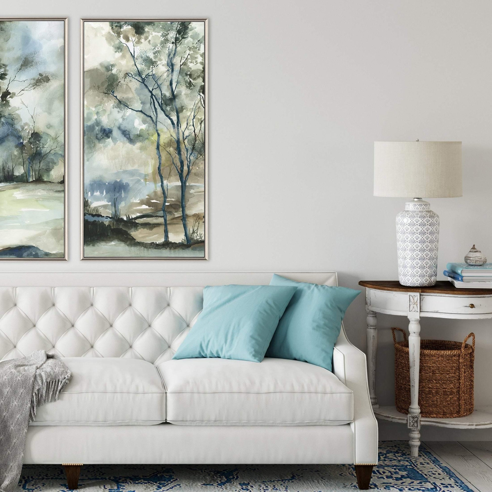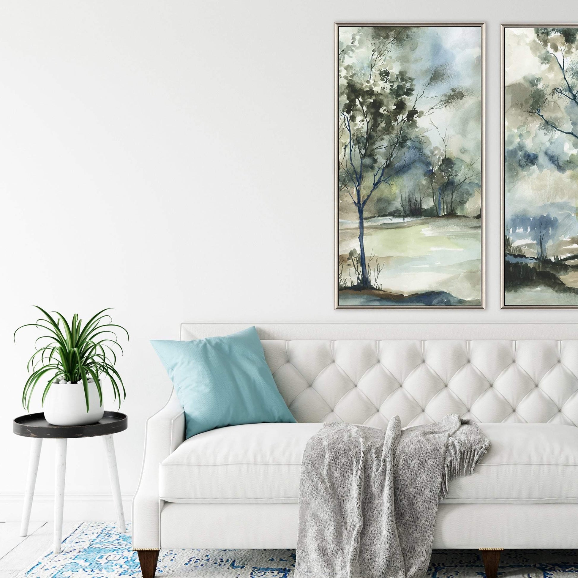 The "Forest Grove I and II Canvas With Silver Frame Hand Assembled" offers a serene depiction of nature. This artwork captures the essence of tall trees reaching for a stormy sky, bringing the tranquility of the outdoors into your home. The canvas features soft brushwork with green and blue hues, creating an abstract style that evokes calmness and peace. The misty background adds depth and intrigue, making it a perfect piece for any room that needs a touch of nature's elegance.
