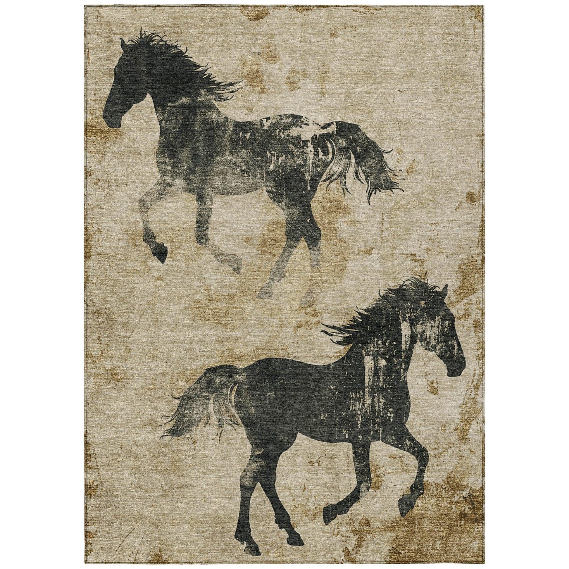 Transform your living space with this versatile rug, perfect for both indoor and outdoor settings. The design features two elegant horses in a distressed pattern, lending a classic yet modern appeal to any room. Crafted from durable polyester, it captures the beauty of the horses with a weathered look, making it a stylish and functional addition to your decor. The brown color blends seamlessly with various design themes, enhancing the aesthetic appeal of your home or patio.