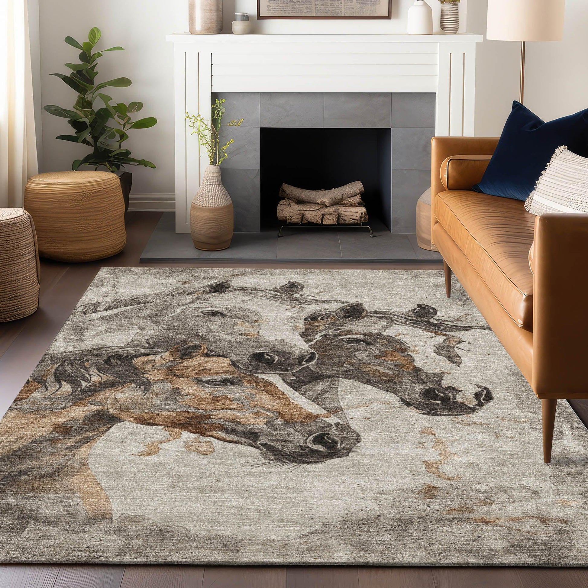 The Galion Brown Washable Rug is an elegant addition to any space, featuring a design that showcases three horse heads in a distressed pattern. This rug offers a transitional flair, making it perfect for modern interiors. The detailed, weathered design captures the beauty of the horses, adding a touch of sophistication to any room. Crafted from durable polyester, this rug promises both style and longevity, ensuring it remains a staple in your home decor.