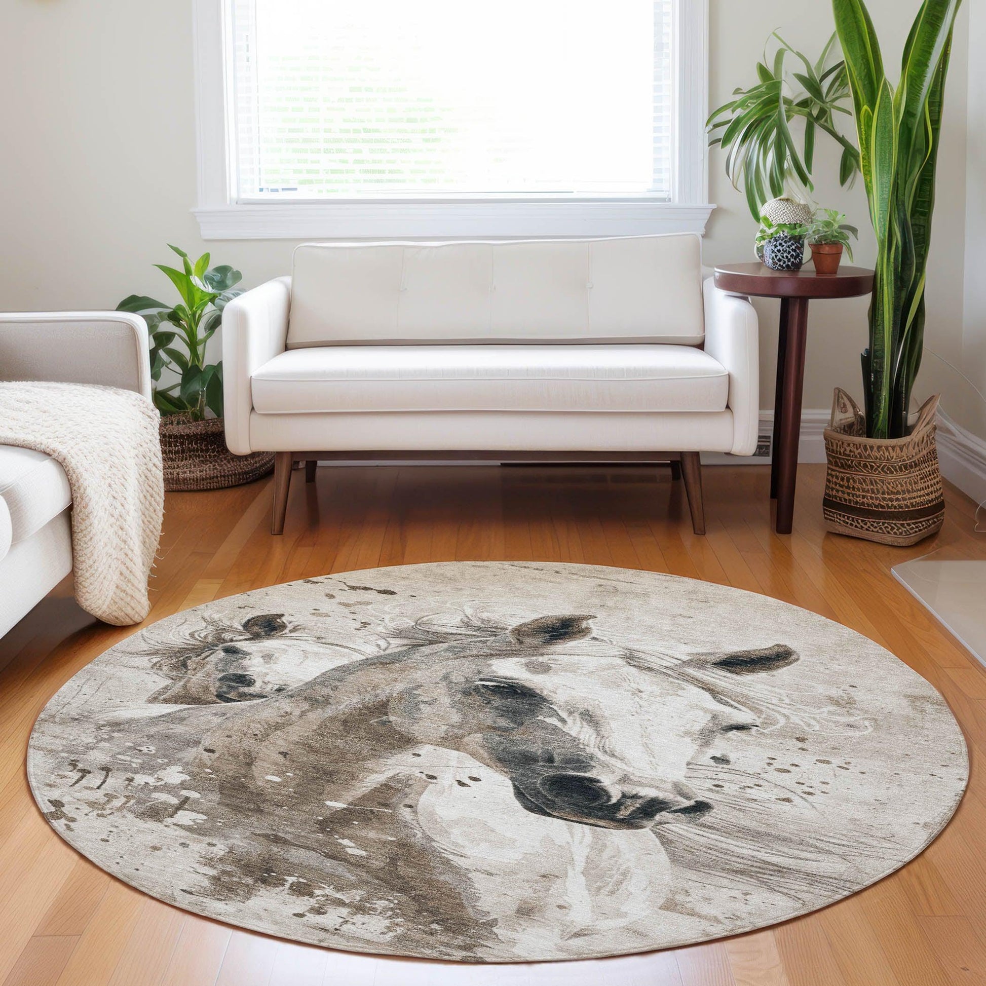 Infuse elegance and functionality into your space with the Galira Ivory Washable Rug. This versatile piece captures the eye with its distinctive design featuring two horse heads in a distressed pattern. The aged depiction of the horses adds character and charm, making it a perfect addition to contemporary interiors. Its ivory hue easily complements various decor styles, ensuring it seamlessly fits into any room.