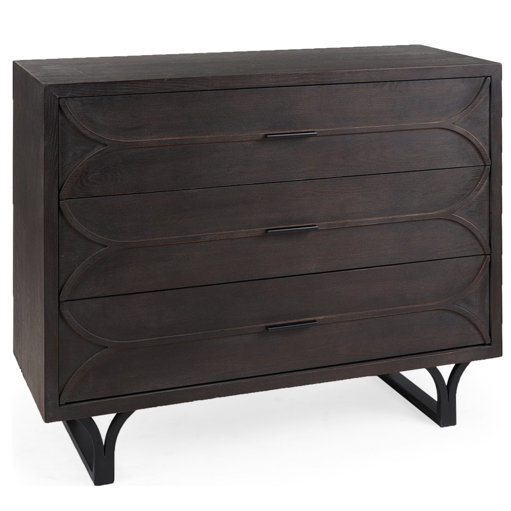 - The Giselle features a sturdy, engineered wood chassis finished in a dark brown stain that is complemented by the matte-black polish on the metal legs and pull-knobs, making this drawer chest a head-turner in your space.