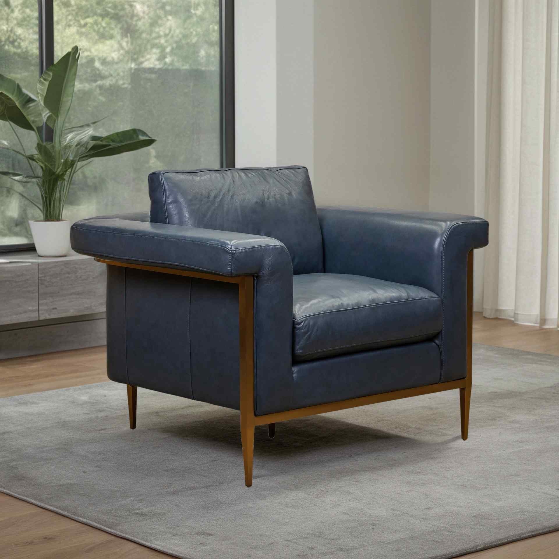 The Goldwyn Chair is a perfect blend of modern design and comfort, available in both Winsome Doe and Winsome Nautilus finishes. Upholstered in soft beige or blue leather, it adds a touch of luxury to any space. The chair showcases quality craftsmanship with its polished brass frame, offering both sturdiness and elegance. Its wide cushioned seating, paired with angular armrests in the Winsome Doe finish or the armless design in the Winsome Nautilus finish, provides a comfortable sitting experience, making it a great addition to living rooms or reading nooks. The foam seat with a fiber overlay ensures coziness for long hours of sitting. The modern mid-century style complements various decor themes, ensuring it fits seamlessly into your home. Whether you're settling in with a book or entertaining guests, the Goldwyn Chair offers the perfect combination of aesthetics and functionality.