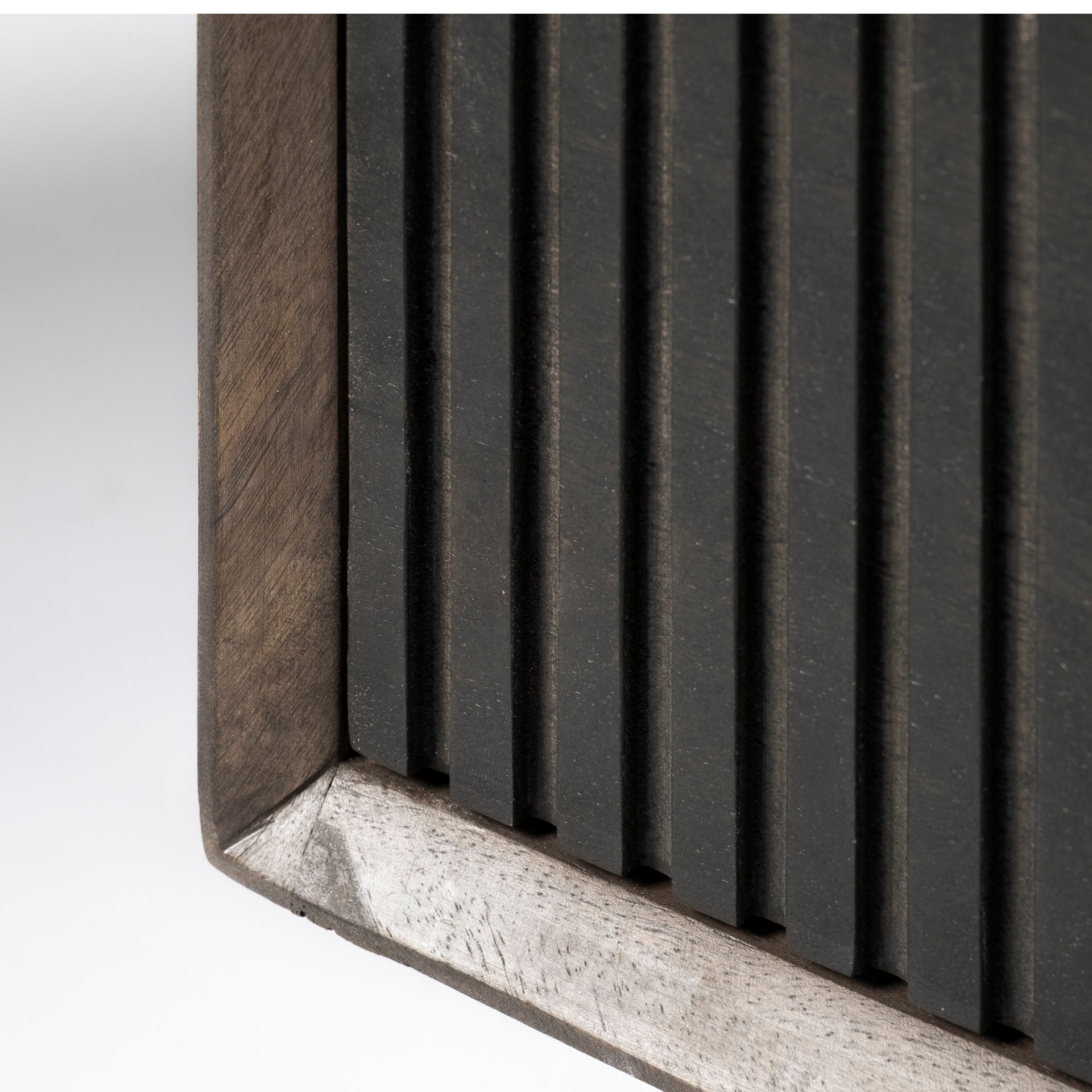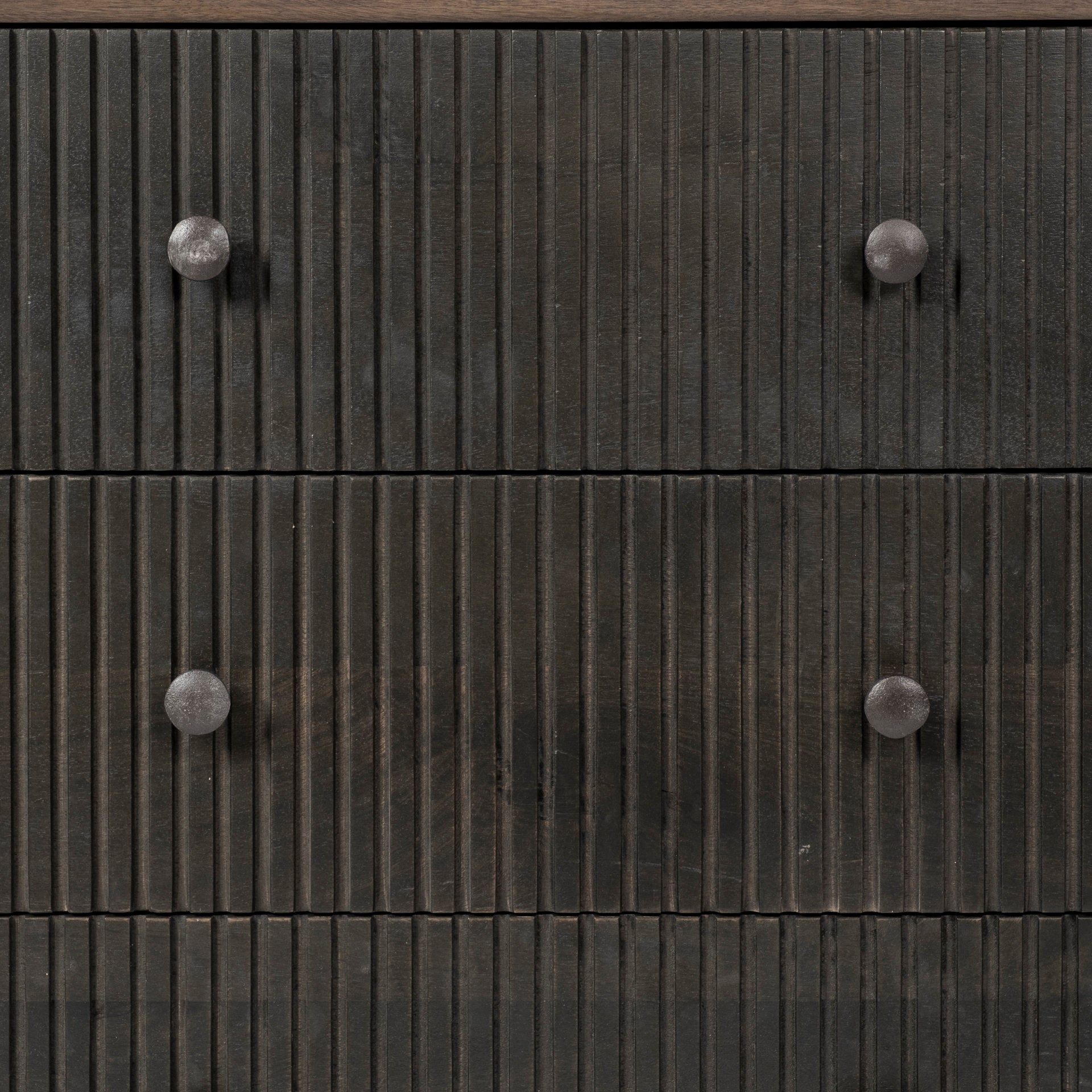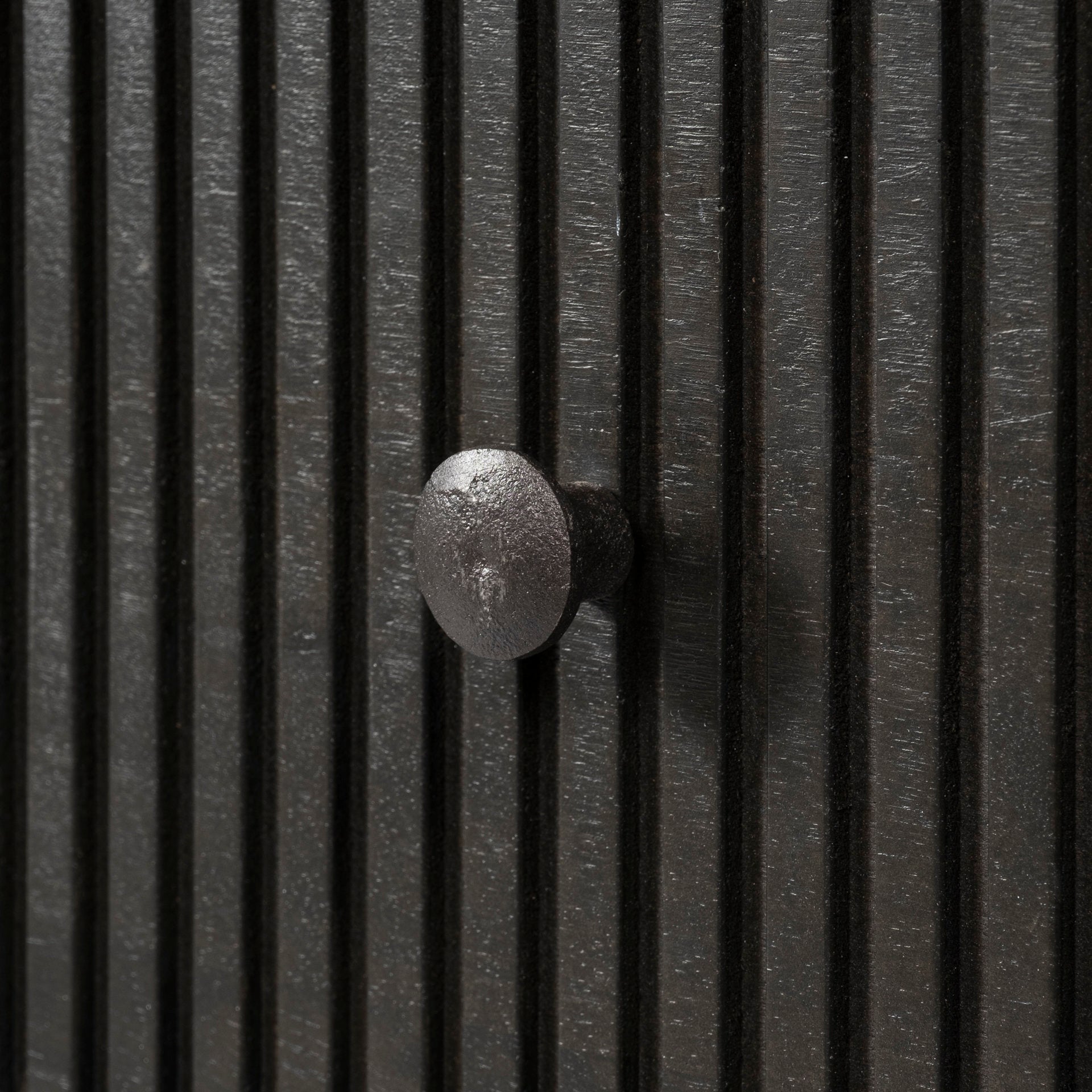Crafted with precision and style, this sideboard is made from solid Indian mango wood, featuring a striking two-tone palette. The medium-brown stain and dark-brown fluted wood drawers give it a unique look. Supported by a robust matte-black iron frame, it stands elegantly on four legs. Its stylish design complements modern interiors beautifully, either as part of the Grace collection or as a standalone piece.