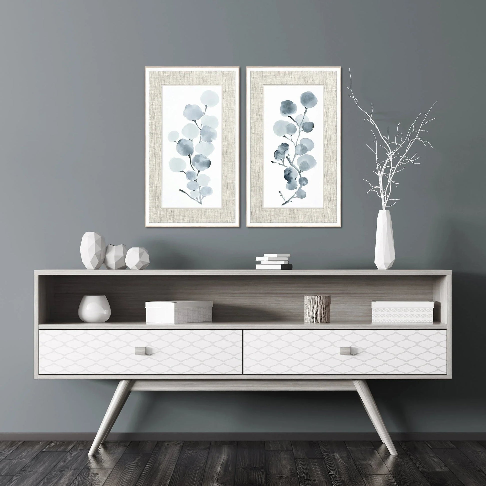 Enhance your living space with a touch of nature through the Gray Botanical S/2 Giclee Hand-Finished Artwork Pair. These artworks feature botanical branches that are elegantly represented with hand-applied decorative paper, showcasing a sophisticated look suitable for any home. The set is framed in ribbed white wood with blonde wood sides, adding a touch of warmth and texture. Each piece is designed to complement a transitional style, making it a versatile addition to both modern and classic interiors.