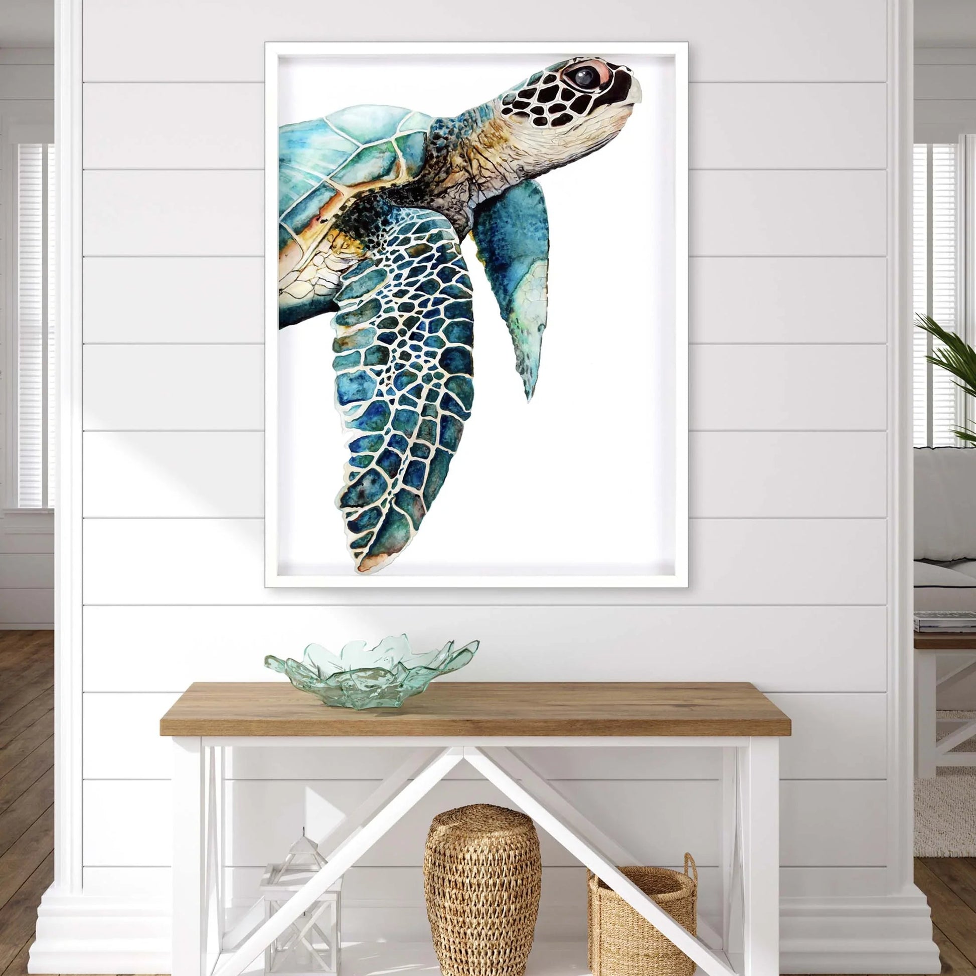 Bring the beauty of the ocean into your home with this vibrant sea turtle artwork. The colorful depiction of a turtle gliding through the water captures the essence of coastal living. The piece is designed in a watercolor style, highlighting rich blues, greens, and browns that bring the sea turtle to life. The intricate details on the shell and flippers add depth and interest, making it a beautiful focal point for any room.