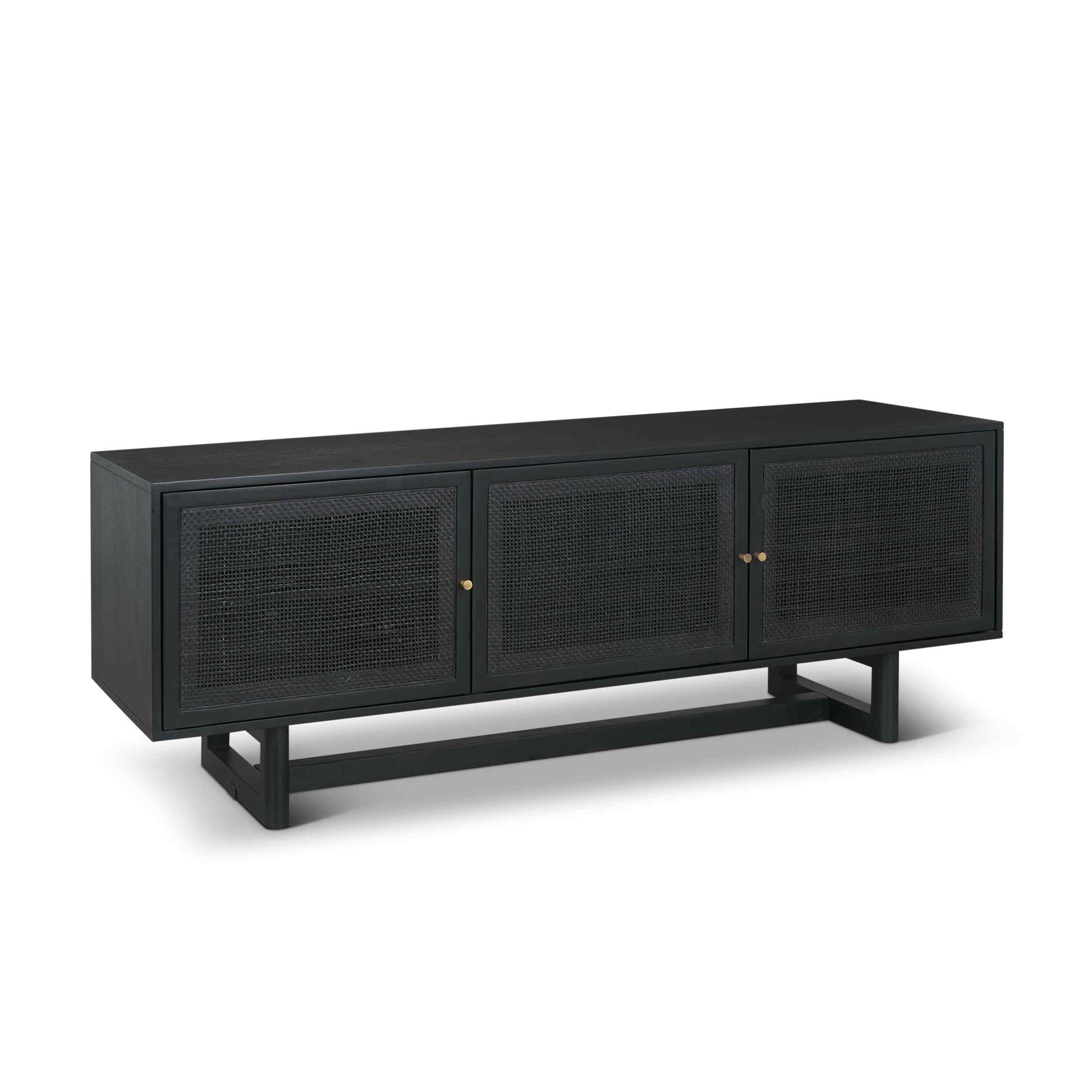 Offering a blend of modern and organic style, this media console is crafted from matte black wood and natural cane. It brings a relaxed yet stylish look to any entertainment space, thanks to its smooth finish. The combination of solid wood and natural cane creates a unique texture that stands out. Its sleek brass knobs add a touch of elegance. With plenty of storage space, it is perfect for organizing media essentials. This piece is not just functional; it also serves as a decorative element, making it a great addition to any room. Elevate your home decor with this versatile console.