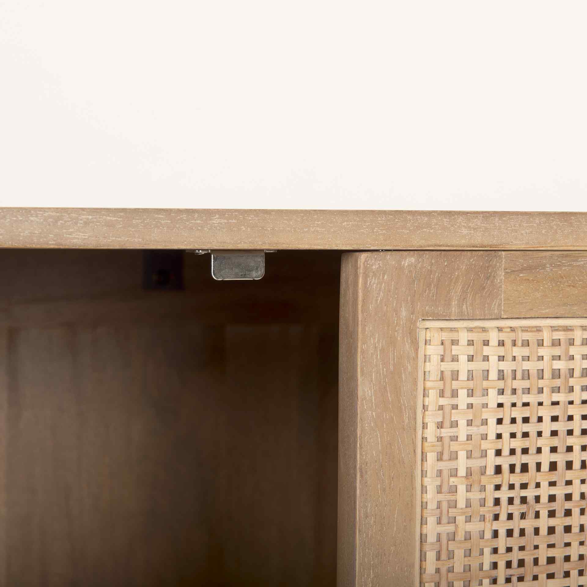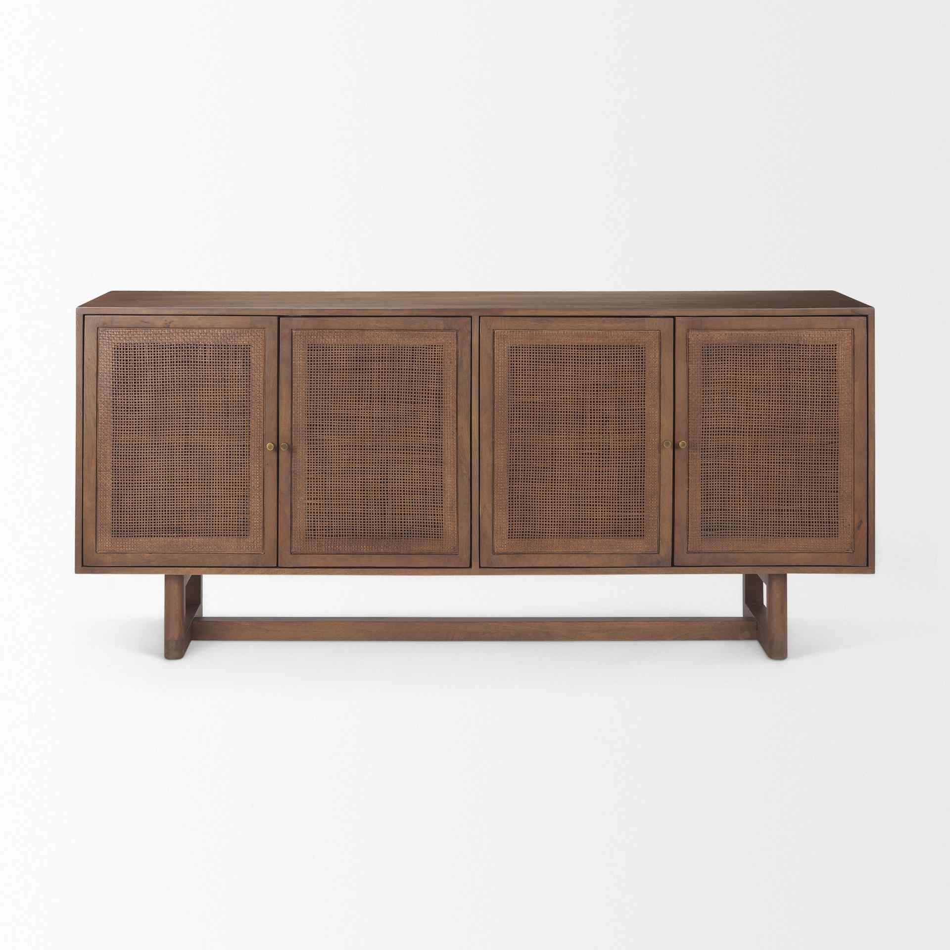 The Grier Four Doors Wooden Sideboard With Ample Storage is crafted from solid mango wood, offering a blend of natural beauty and durability. Its brown finish accentuates the wood's stunning grain pattern, making it a charming addition to any room. The sideboard features four cabinet doors with latticed cane fronts, adding a touch of texture and style. Brushed gold handles provide a subtle yet elegant contrast, enhancing the overall aesthetic. This piece is designed not only for visual appeal but also for functionality, making it a perfect fit for living rooms, media rooms, or even bedrooms.