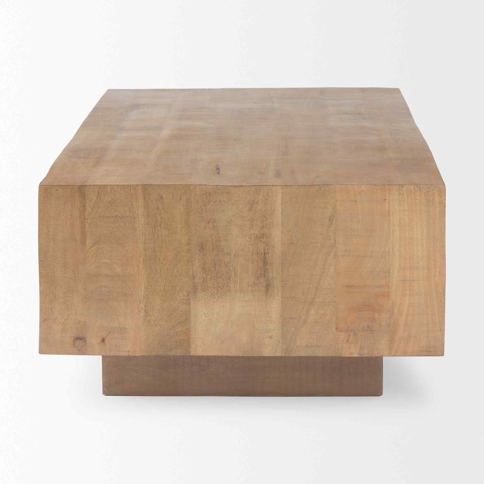 The Hayden Wooden Rectangular Coffee Table brings a warm and inviting touch to any living space. Crafted from solid wood, this coffee table showcases a light brown finish that complements its rustic, contemporary appeal. Its rectangular shape and smooth surface make it a versatile addition to both modern and traditional settings. The unique design features a solid, box-like top resting on a recessed base, creating an eye-catching floating effect. This piece not only serves as a functional table but also as a statement piece that adds depth and character to your home.