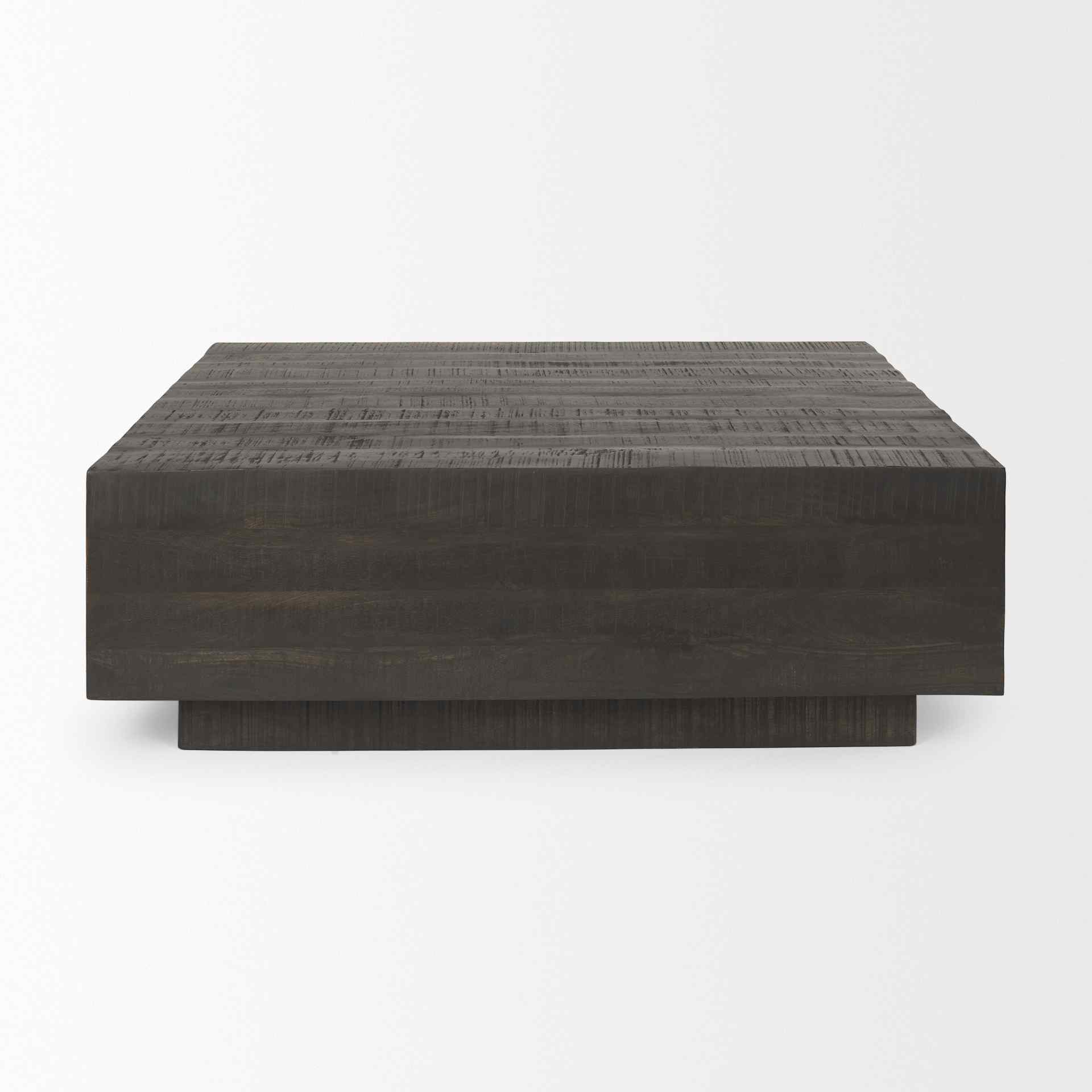 The Hayden Wooden Square Coffee Table offers a blend of rustic charm and contemporary style with its solid wood construction and brown finish. Its natural, distressed texture brings an organic depth to any living space, enriching the room with a touch of warmth. Its minimalist design features a solid, box-like top that appears to float above a recessed base, creating an eye-catching focal point. This design not only adds visual intrigue but also complements a wide range of interior styles, from rustic to modern.