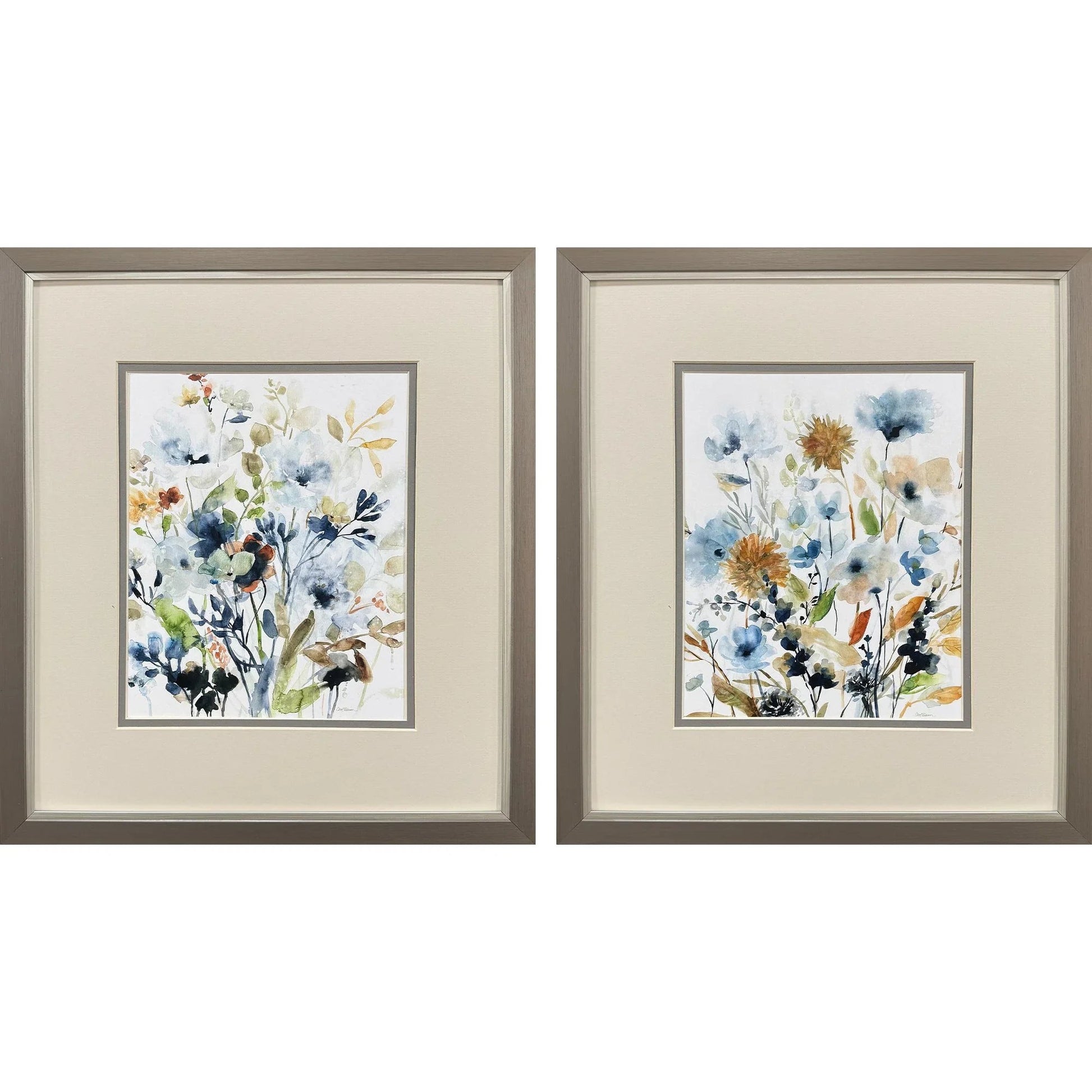 Bring the beauty of a blooming garden into your home with this charming set of floral art. Perfect for adding a touch of nature to any space, these two framed pieces feature a delightful mix of spring flowers. The watercolor style brings out the soft hues of blue, yellow, green, and orange, creating a serene and inviting atmosphere. Each piece is double matted in oyster and gray, adding depth and elegance to the artwork.