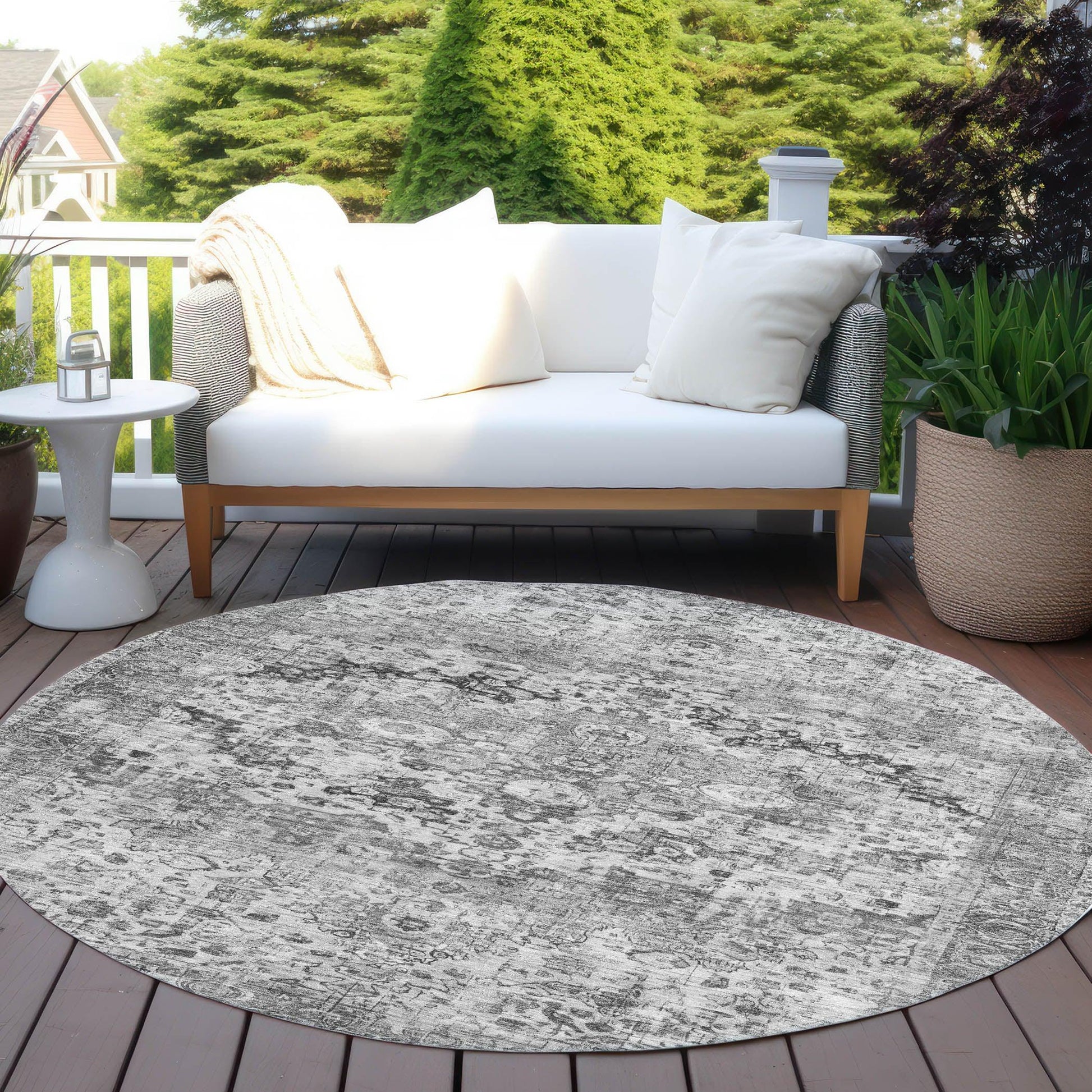 The Jaelien Gray Washable Rug brings a touch of elegance to any space with its intricate border design that beautifully frames detailed central motifs. This rug offers a traditional style that fits seamlessly into classic décor, enhancing the character of any room. Made from durable polyester, it promises both style and practicality. The rug is designed for versatile use, both indoors and outdoors, making it a great addition to patios, living rooms, and more. Its UV-stabilized feature ensures it maintains its color even under direct sunlight, although it performs best in shaded areas.