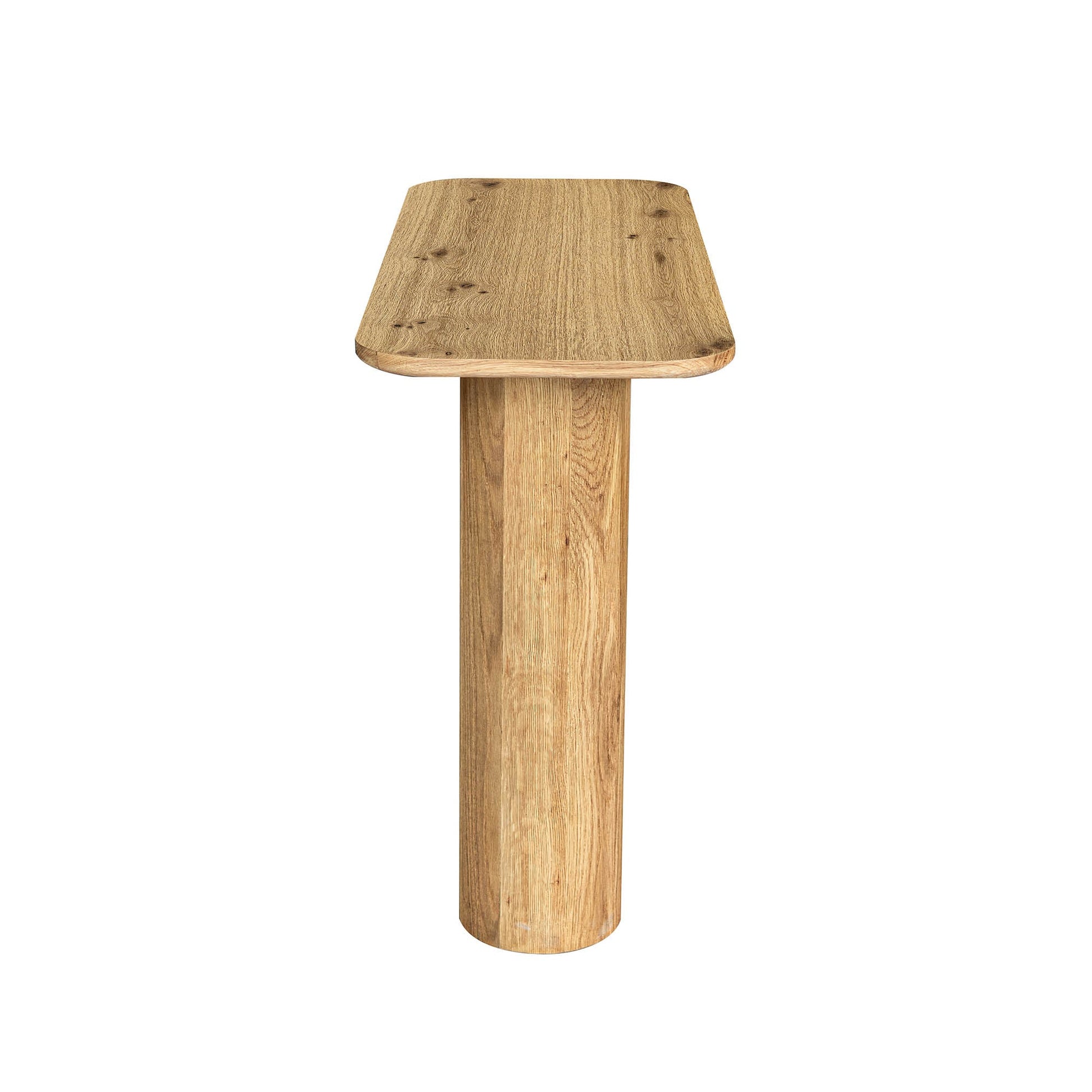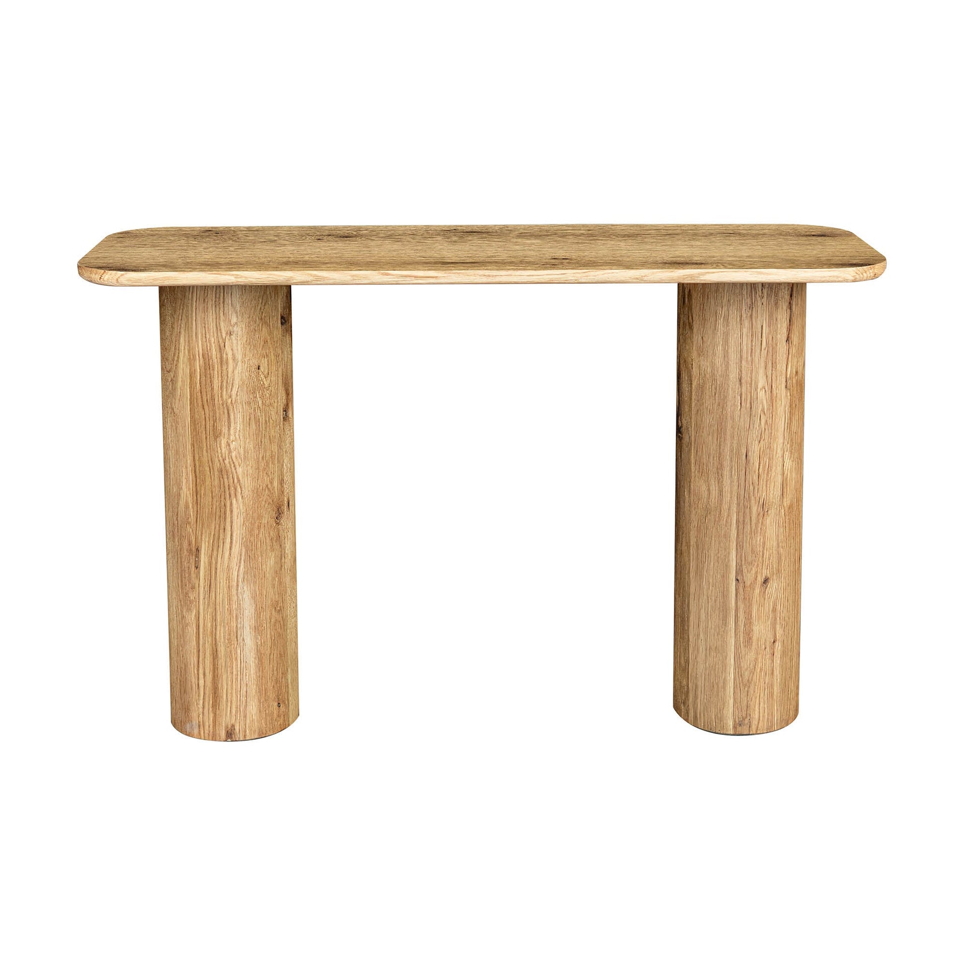 The Jasper Console combines style and function in its elegant and minimalist design. Crafted from oak, MDF, and oak veneer, this console showcases a natural wood grain texture that adds warmth to any room. Its light brown color and smooth finish make it a versatile piece that complements various decor styles. With an oval top and two cylindrical legs, it offers a unique yet simple design. Whether used in an entryway, living room, or hallway, the Jasper Console provides a perfect spot for decorative items or essentials. Its sturdy construction ensures durability, making it both a practical and stylish addition to your home.