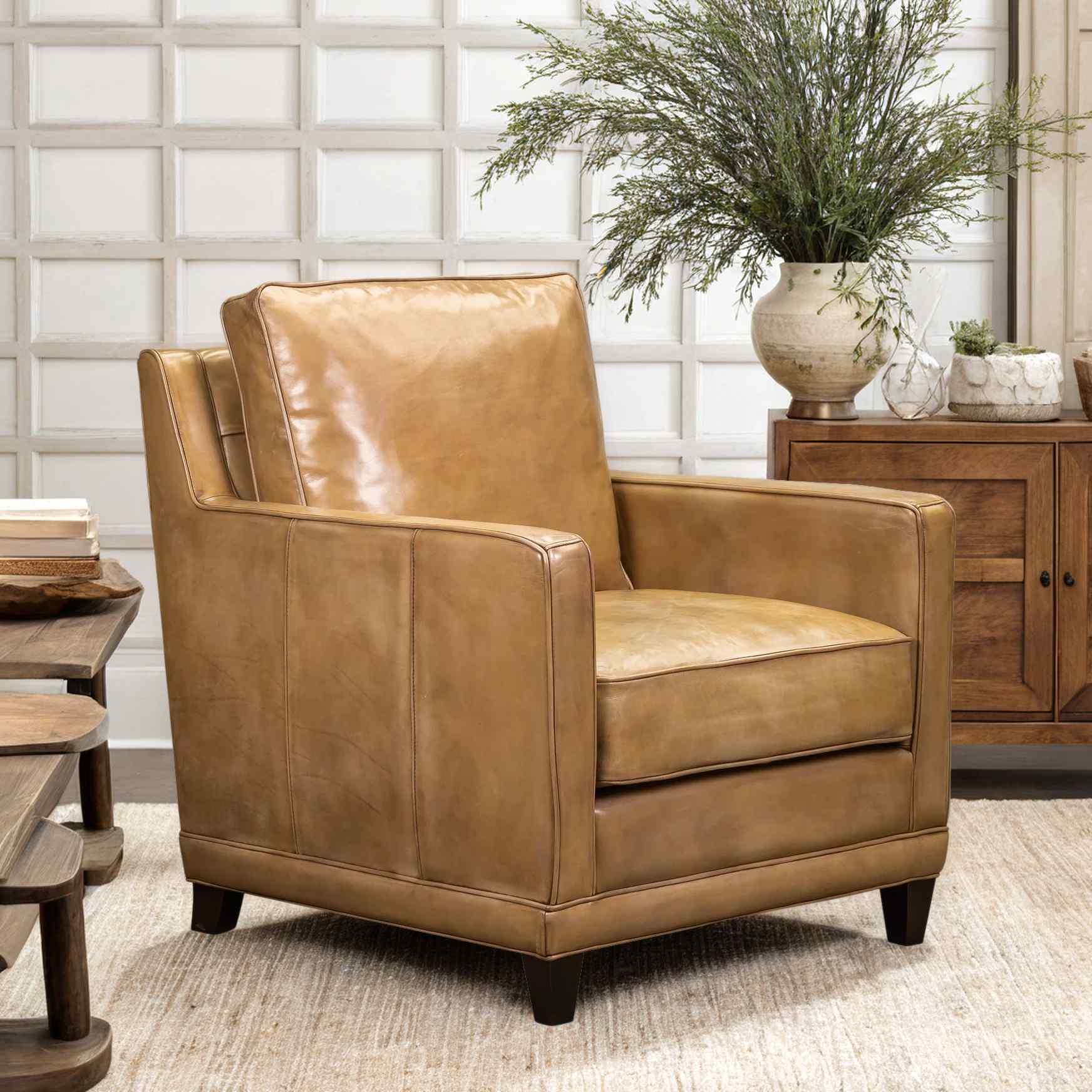 The Josie Chair in Bedford Branston brings a touch of modern style to any room. Its minimalist design fits effortlessly into both simple and chic settings. Crafted with high-quality leather, this chair offers a comfortable seating experience with its foam and fiber overlay seat construction. The sleek armrests and square shape add to its contemporary appeal, making it a versatile choice for living rooms, offices, or cozy reading nooks. The dark wooden legs finished in a rich coffee bean color provide a sturdy base, complementing the luxurious Bedford Branston finish.