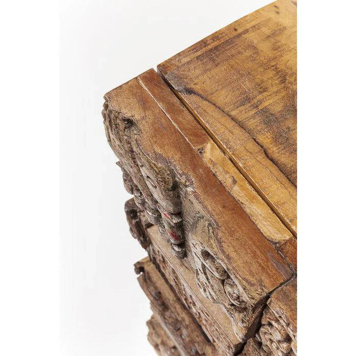 Experience the epitome of luxury with our 36" Hand Carved Karri Stacked Wood Blocks 2 Doors Accent Cabinet. Meticulously crafted from reclaimed mango wood, each block showcases exquisite workmanship and is coated with a water-resistant lacquer. Embellished with bronze square pulls and a hand-applied rustic finish, this cabinet offers ample shelving and 3 spacious drawers for storage. A stunning addition to any room, this unique cabinet adds a touch of elegance and sophistication. Made using tongue and groove joint methods, this one-of-a-kind piece is composed of Karri Stacked block design, each sourced from different furniture pieces.