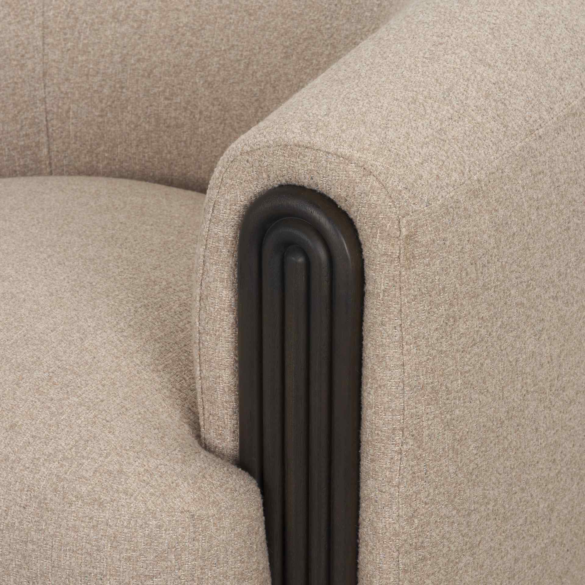 The Kornelia Barrel Accent Chair adds style and comfort to any room. Wrapped in a soft, textured mushroom-gray fabric, it blends well with various decor styles. The chair's elegant curved design and barrel shape make it a cozy spot for relaxing. Espresso-finished wood accents offer a touch of warmth, enhancing its attractive look. This chair fits perfectly in living rooms, home offices, or bedrooms, providing both comfort and a stylish touch. Its neutral beige color complements many color schemes, making it a versatile choice for any space. Enjoy the perfect blend of form and function with this charming chair.