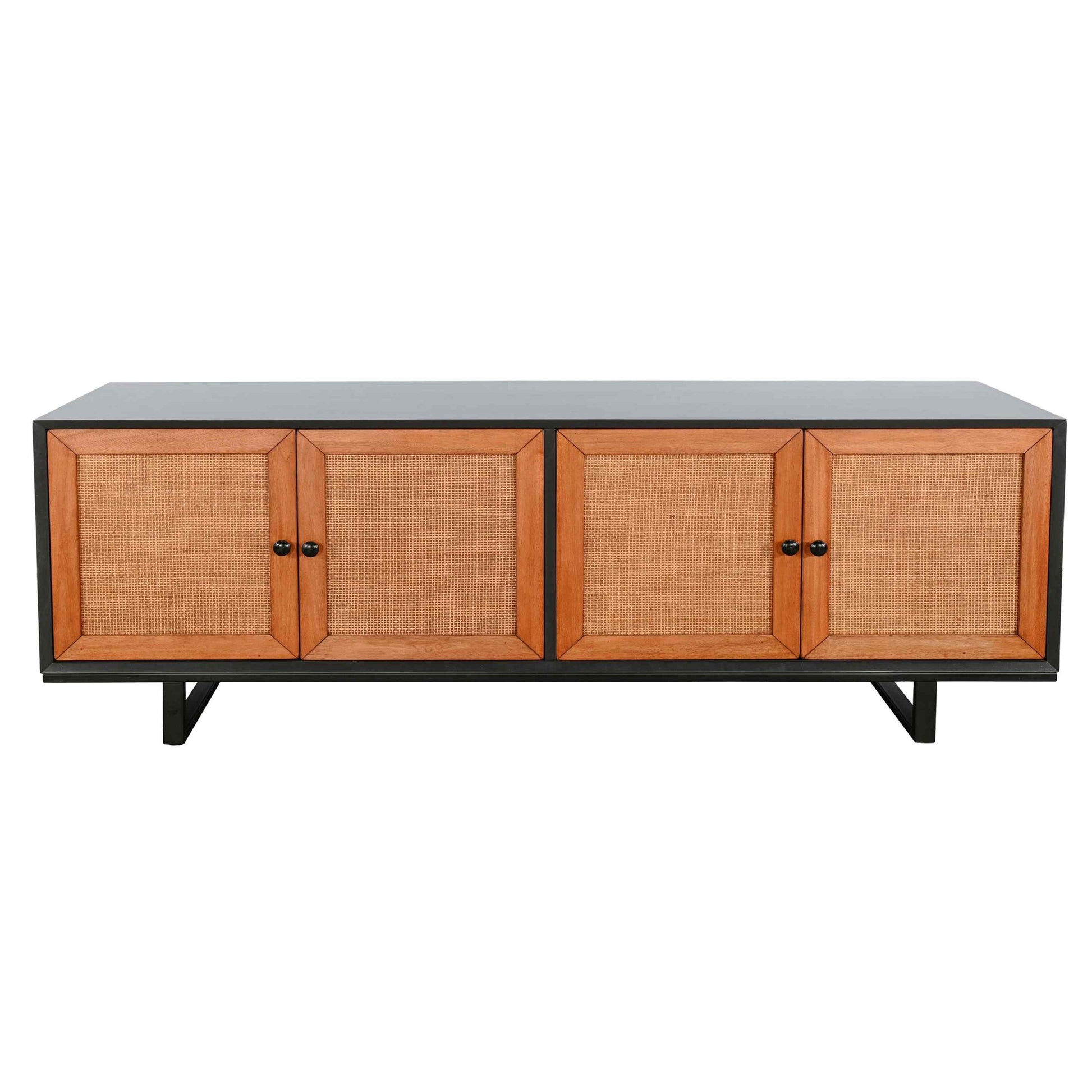 Bring warm texture and Langford Modern sophistication to your space with the Black and Natural Cane Credenza. This piece features a matte black frame and contrasting natural rattan door panels framed in rich wood, delivering a bold yet balanced look. It fits seamlessly into Langford Modern, boho, or transitional interiors. The credenza has four spacious cabinet doors offering plenty of concealed storage, making it a practical and stylish solution for organizing dining essentials, electronics, or everyday clutter. Whether placed in the dining room, living room, or entryway, this credenza is sure to make a statement.
