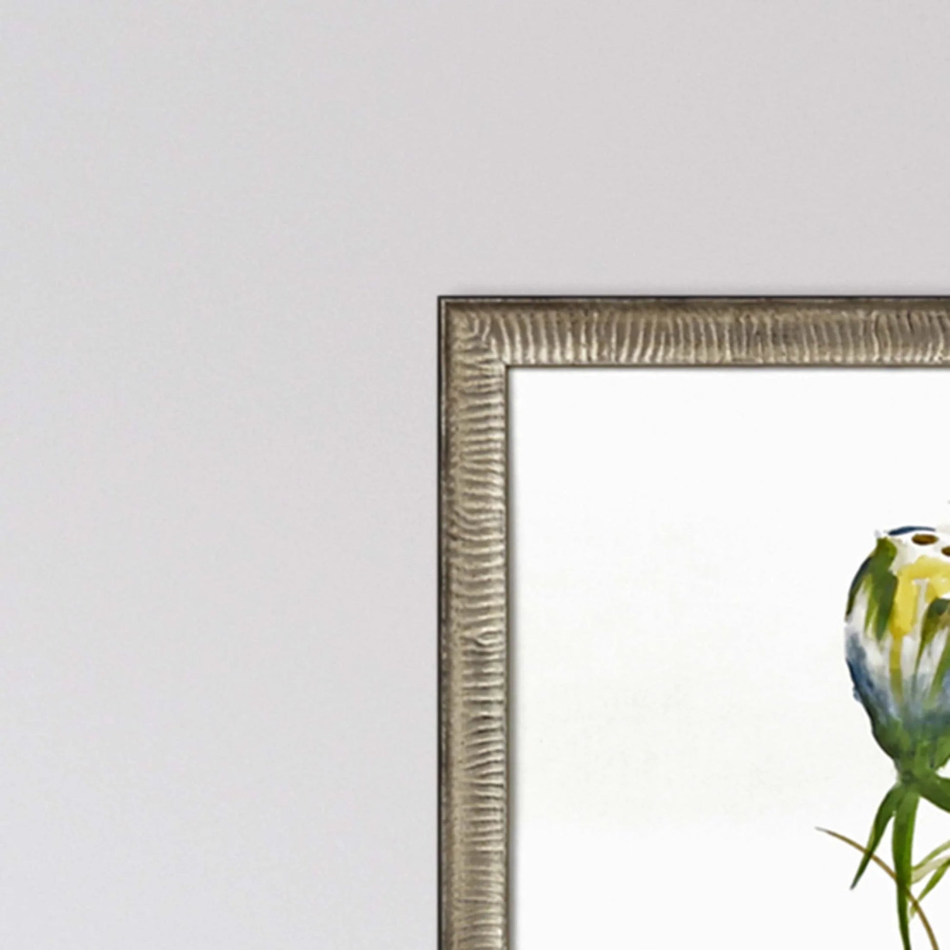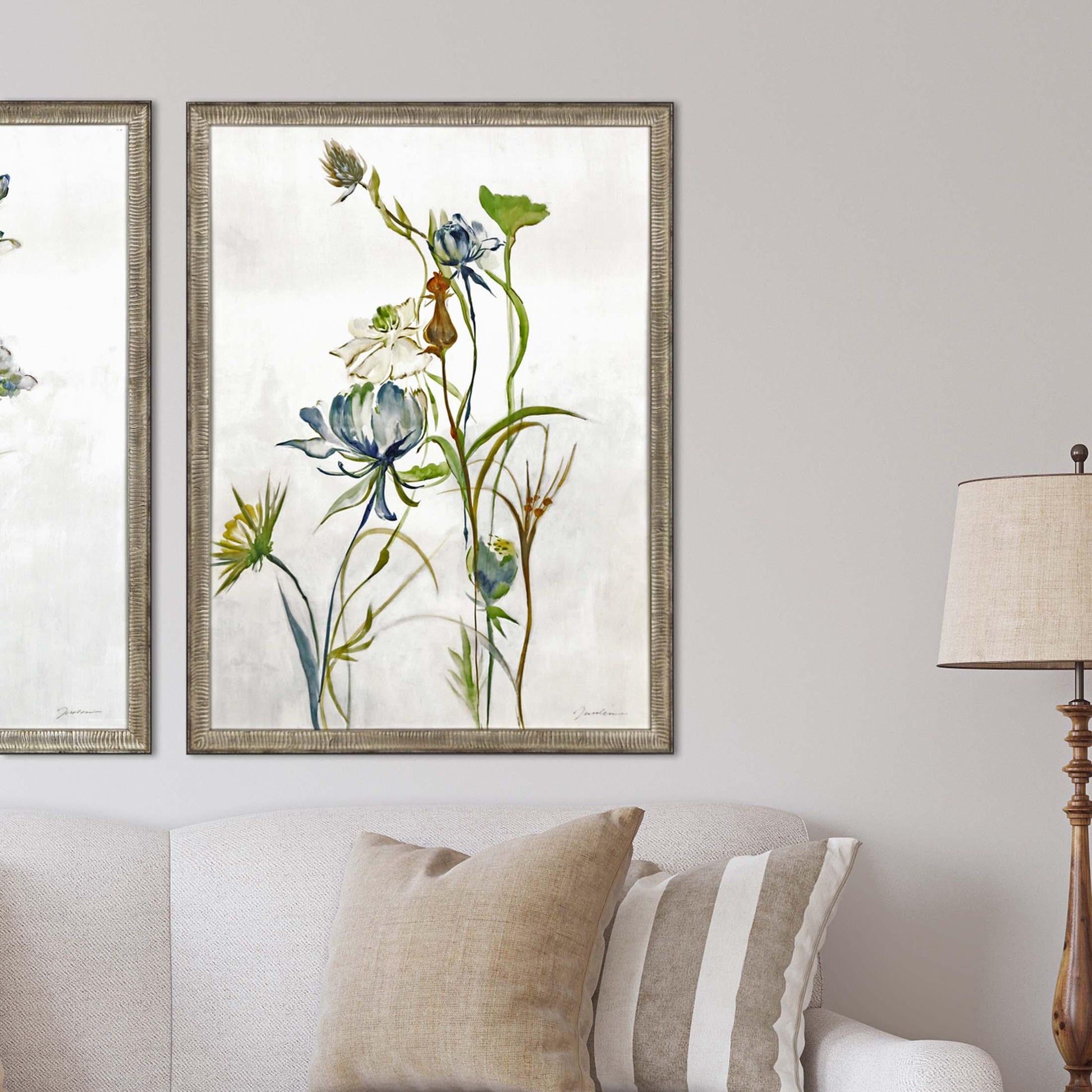 This Framed Wall Art piece captures the serene beauty of late summer wildflowers. Crafted with a meticulous eye for detail, it features gorgeous flowers framed in an antique silver leaf sloped wood frame. The frame's embossed face and black painted side add a touch of elegance, complementing the muted colors of blue, green, yellow, and white. The botanical design, with its delicate stems and leaves, invites a calming presence into any space, making it a perfect addition for those who appreciate nature-inspired decor.