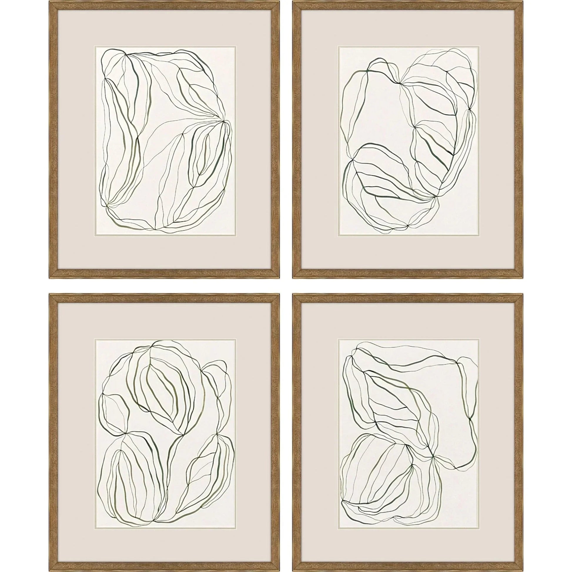 Lines swirl and intersect to form free-flowing organic shapes in this captivating set of four abstract art prints. Each piece is matted in a soft putty color, adding a touch of warmth and contrast against the minimalist black and green line designs. The rectangular shape of the artwork is elegantly framed in an antique gold wood that features an embossed weave pattern, enhancing its contemporary charm. These art pieces are designed to attract attention, making them a perfect addition to any room that seeks a modern aesthetic.