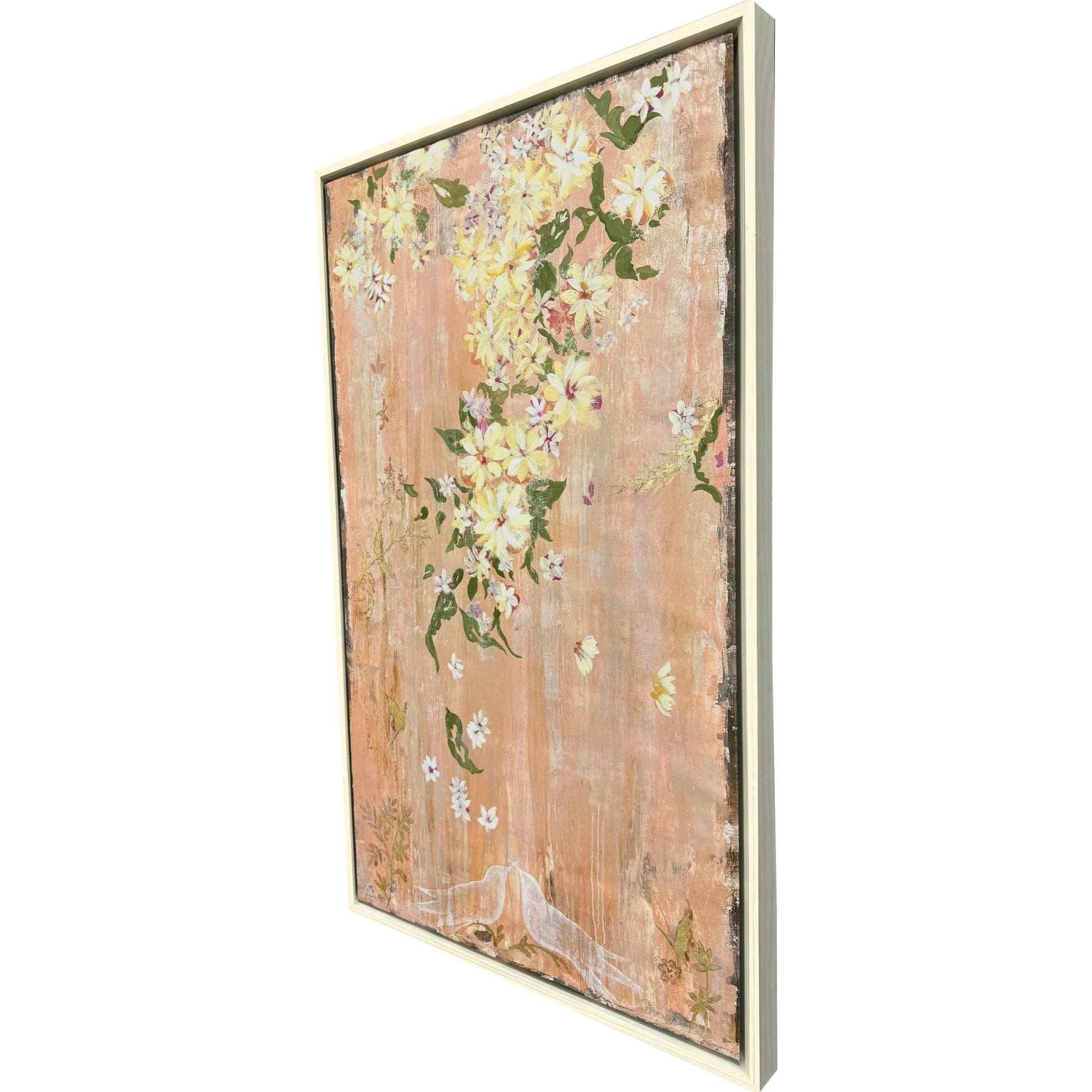 This artwork is presented in a vertical composition, hand-stretched and mounted in a whitewash wood floater frame that complements its transitional style. The lack of glass in the frame offers a more immersive viewing experience, allowing the vibrant colors and textures to stand out. The combination of canvas and wood materials ensures durability, making it a lasting addition to your home decor.