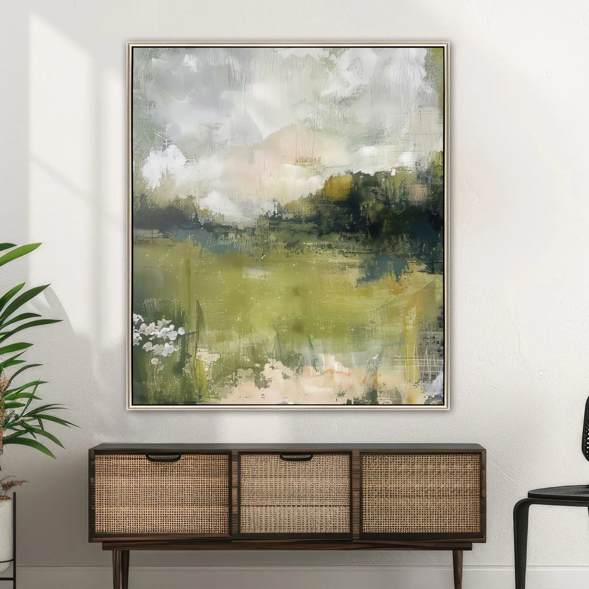 Billowing clouds gracefully traverse a lustrous green landscape, evoking a serene connection with nature. This exquisite piece, crafted as a giclee on canvas, captures the subtle nuances of a cloudy sky with hints of white and pink, beautifully blending with the dominant green palette. A contemporary touch is added through a brushstroke texture, presenting a nature-inspired masterpiece that brings tranquility to any space. The harmonious blend of soft pastels makes it a versatile choice for various decor styles.
