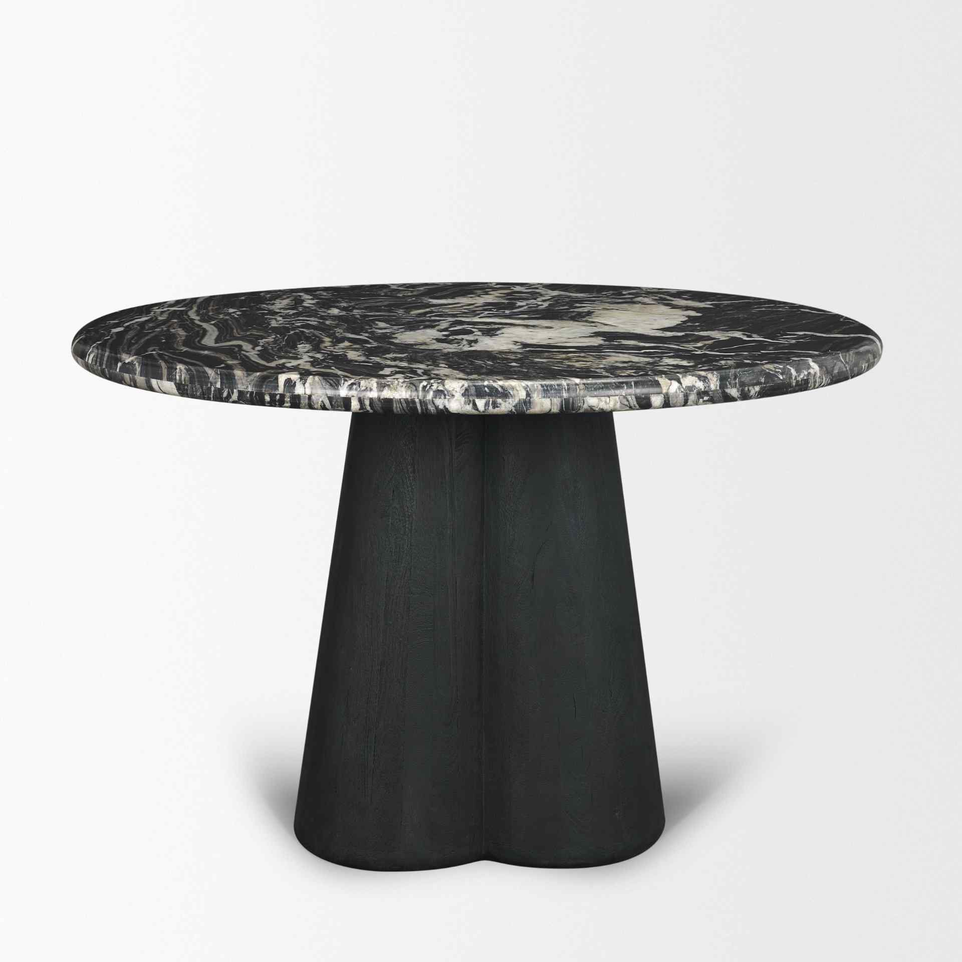 Experience elegant dining with this round table, featuring a black forest marble top with intricate black, white, and gold veining. The table rests on a sculptural clover-leaf pedestal base, creating a stunning focal point for your dining room. Constructed from solid wood and marble, it offers both durability and style. The matte black wooden base contrasts beautifully with the marble, making it a standout piece ideal for modern or contemporary spaces. Natural variations in the marble ensure each table is unique, adding character and charm to your home. Elevate your dining experience with this exquisite addition.