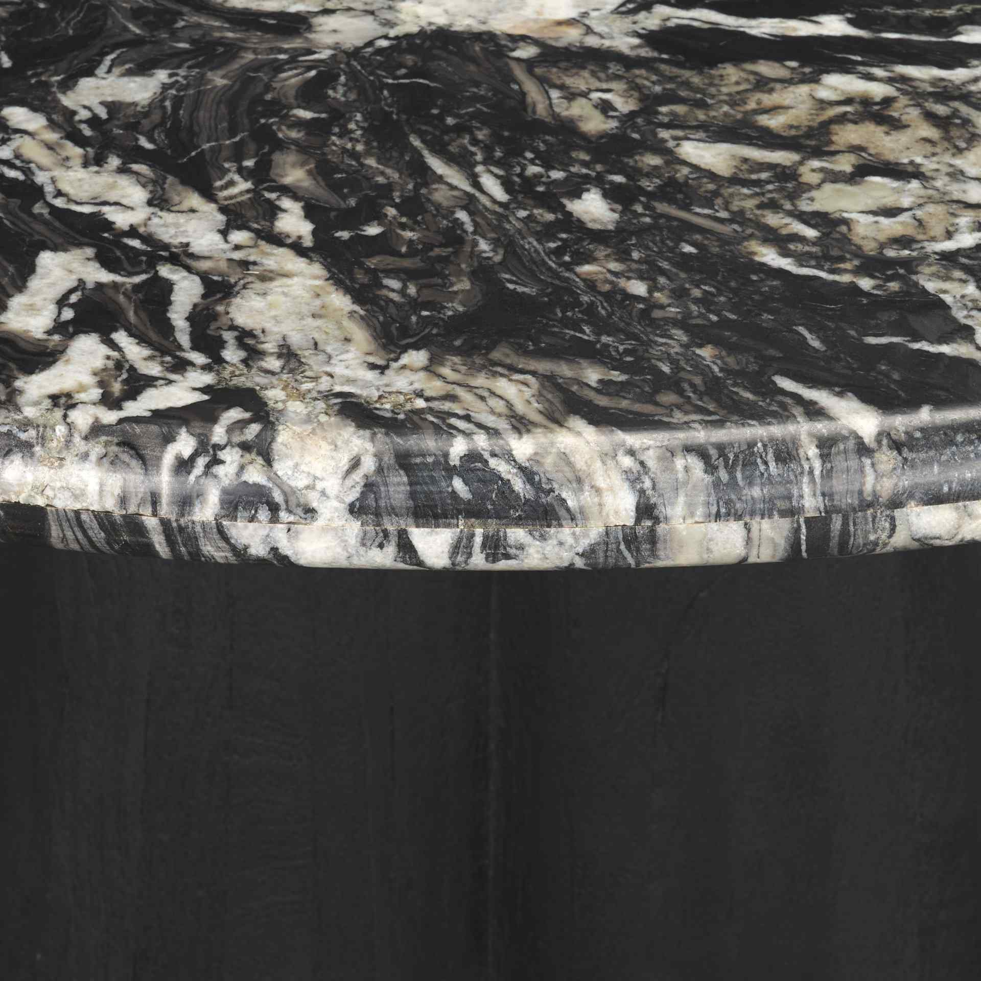 - Material details: Round tabletop with high-contrast black forest marble and matte black wooden base
