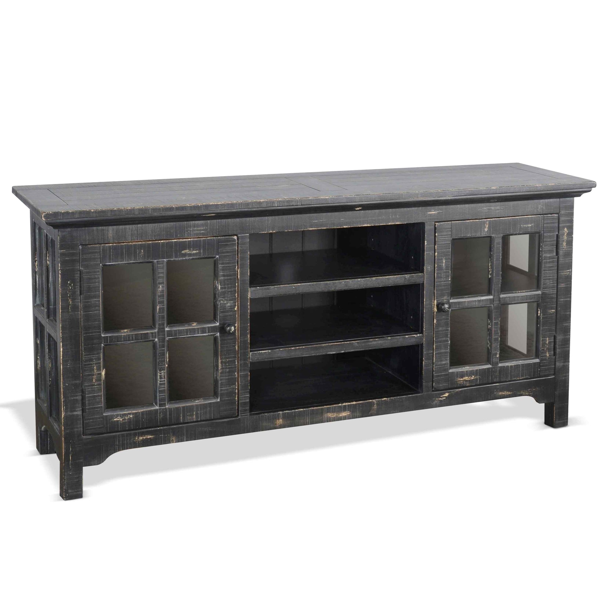 The Marina TV Console is a stylish addition to any living room, combining form and function effortlessly. This 62-inch entertainment stand offers ample storage with open shelving and elegant glass cabinet doors. The distressed finish adds a touch of shabby chic charm, while cutouts at the back allow for easy wire management. Crafted from durable mahogany, this console's adjustable shelves make it versatile for various storage needs. The window-framed glass doors and sides provide a sleek look that complements any decor. Arriving fully assembled, it’s ready to enhance your space right out of the box.