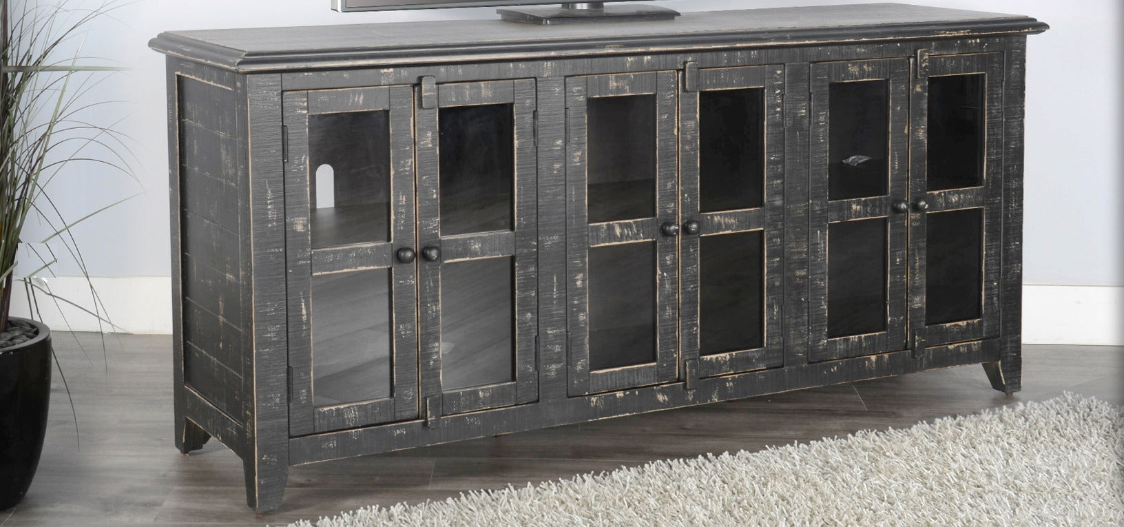 Elegance meets function with this stunning 70-inch TV console, perfect for enhancing your living space. Crafted from high-quality mahogany solids and veneers, the console offers durable distressed and black sand finish that complements any decor. It features ample storage for your media components behind elegant glass panel doors, complete with wooden latches. With adjustable wood shelves, you can customize the interior to fit your needs. A thoughtful cable management system ensures your space remains tidy, while its sturdy build supports TVs up to 80 inches. This console effortlessly blends style and practicality, making it an ideal choice for any home.